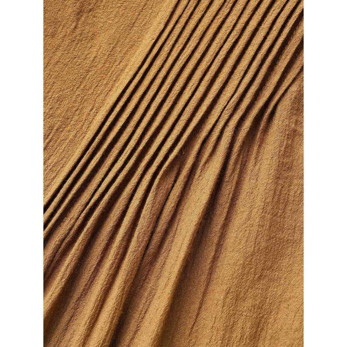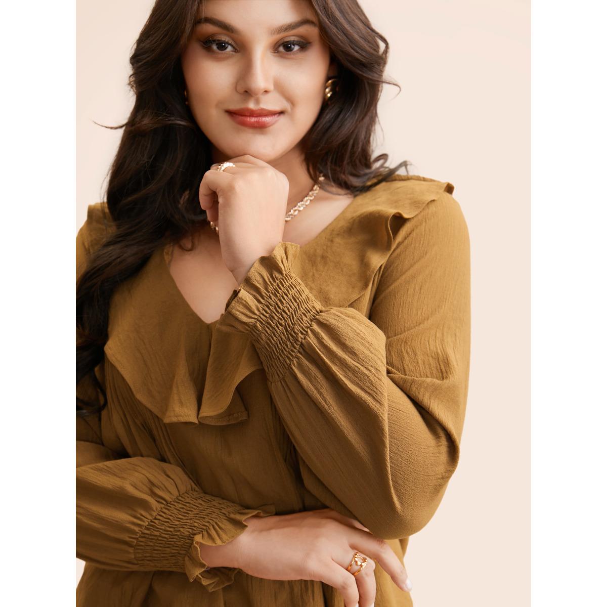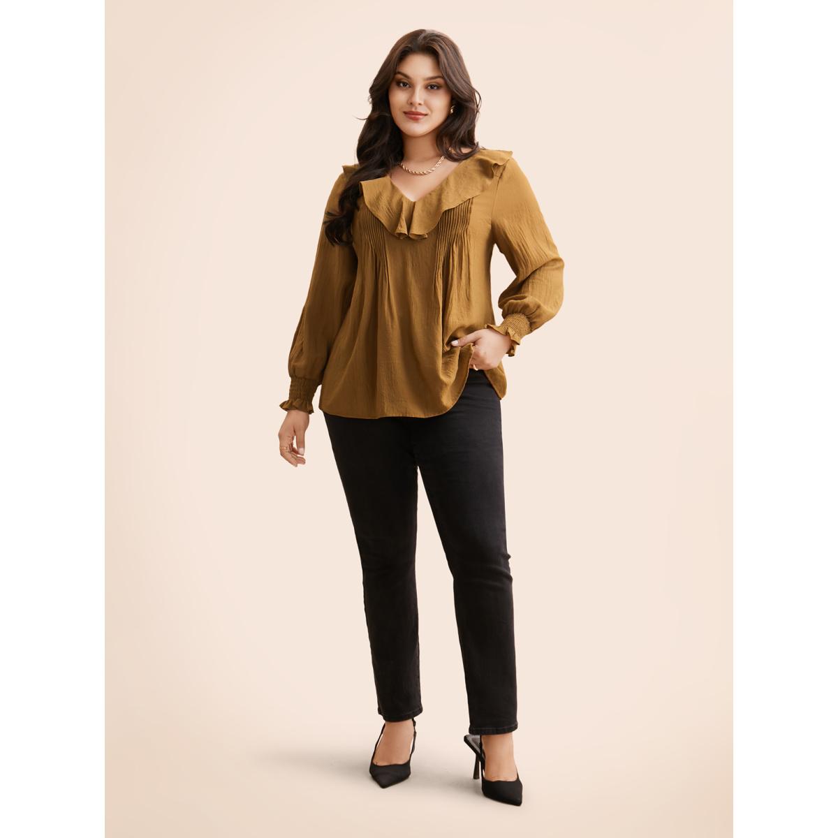 Plus Size Yellowishbrown Solid Texture Pleated Ruffle Trim Blouse Women Romantic Long Sleeve Deep V-neck Elegant Blouses BloomChic 28/5X