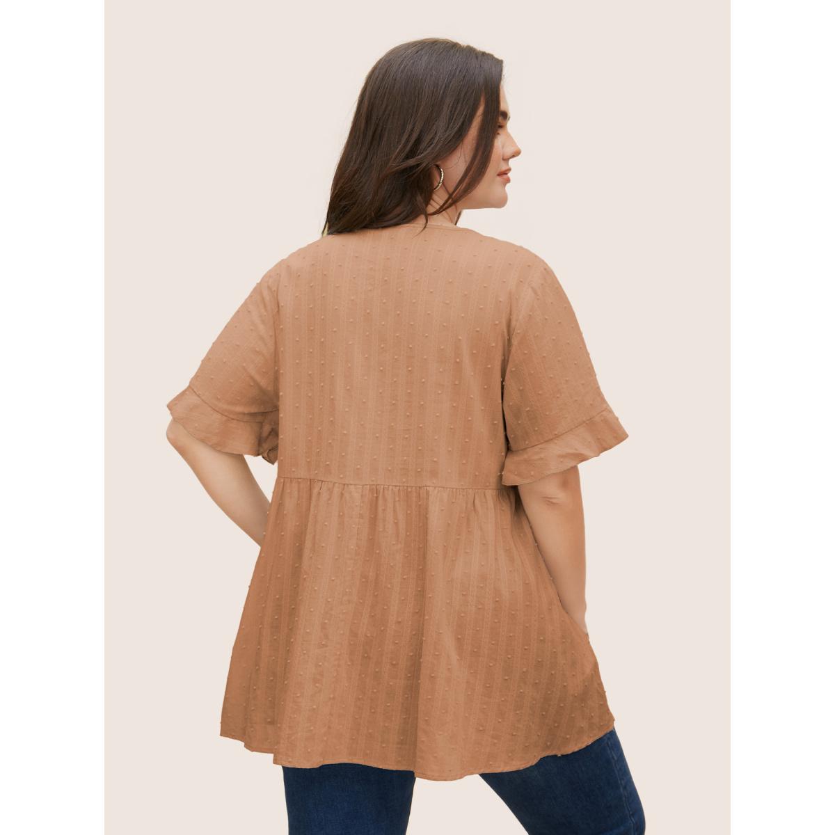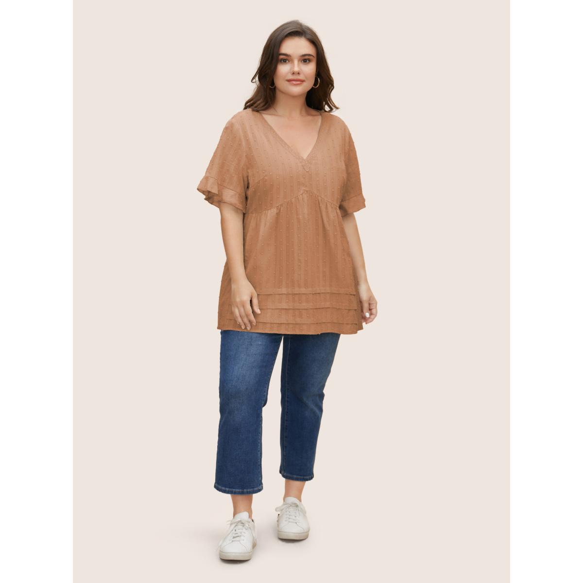 Plus Size Yellowishbrown Textured Lace Panel Pleated Pocket Blouse Women Casual Short sleeve V-neck Everyday Blouses BloomChic 22-24/3X
