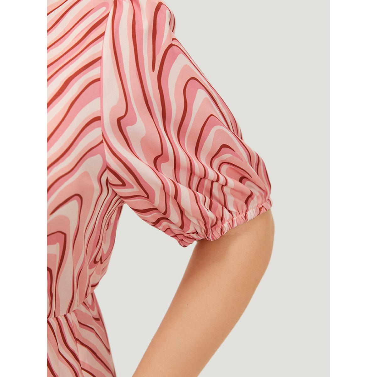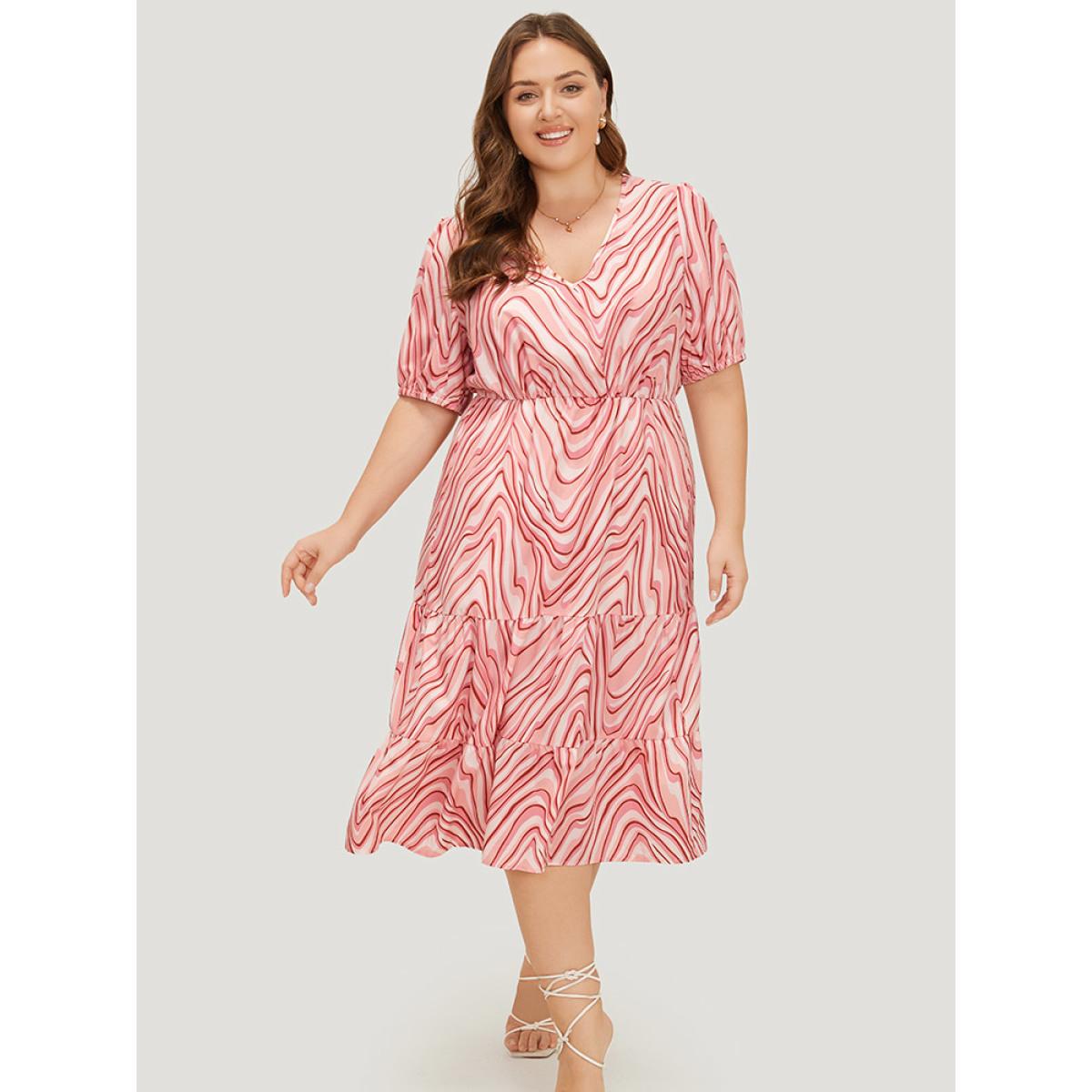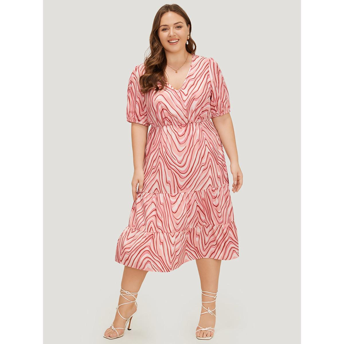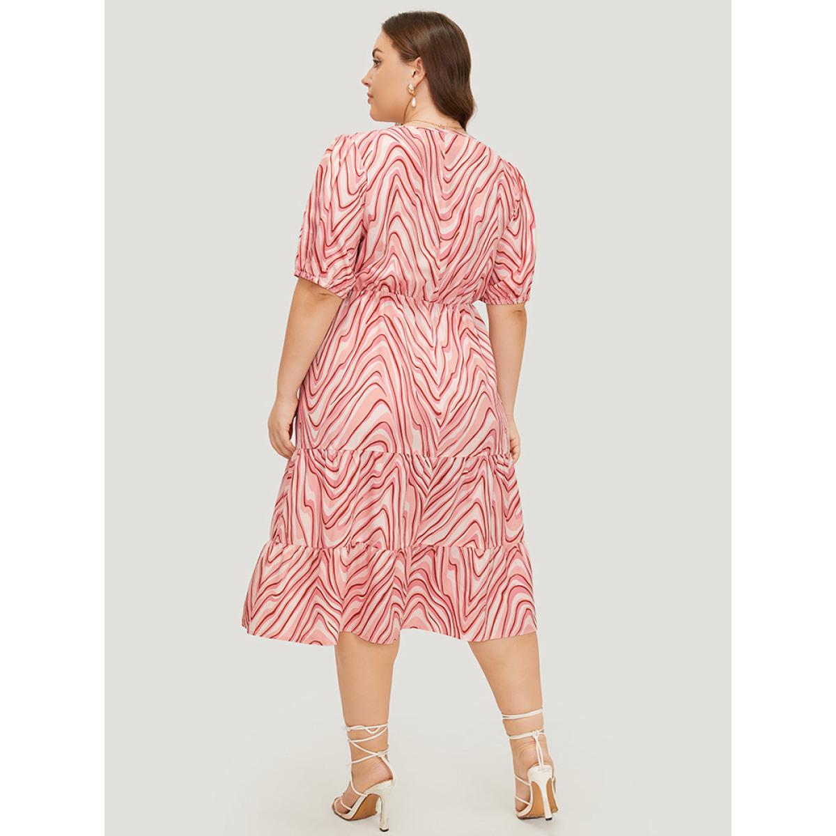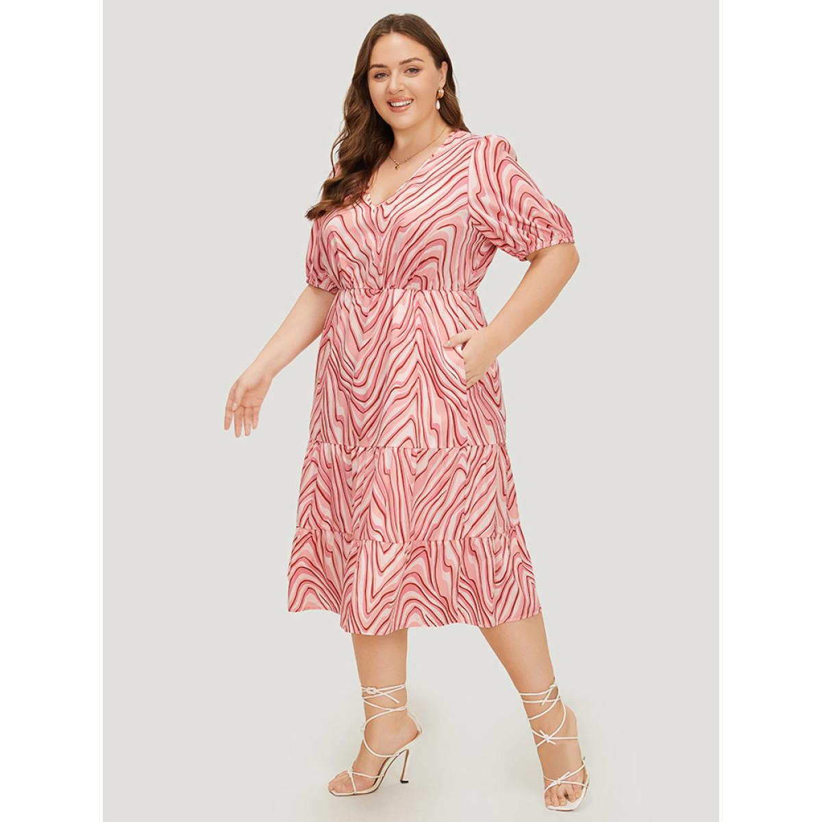 Plus Size Zebra Print Puff Sleeve Pocket Layered Hem Dress Crepe Women Elegant Tiered V-neck Short sleeve Curvy Midi Dress BloomChic 18-20/2X