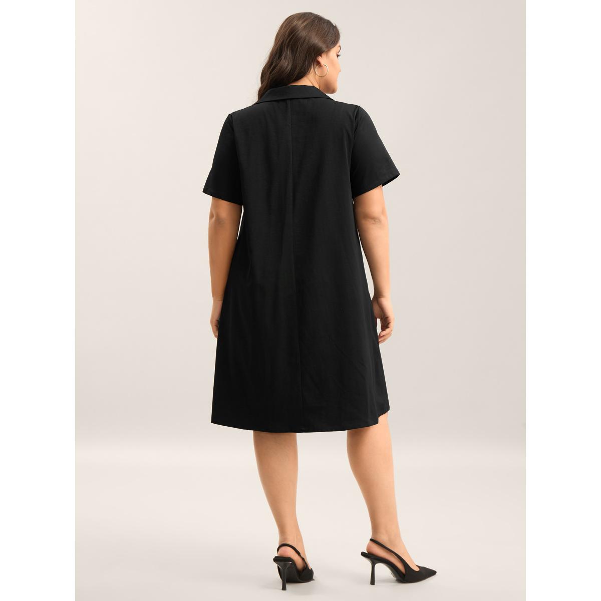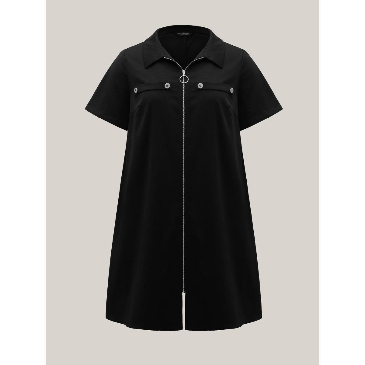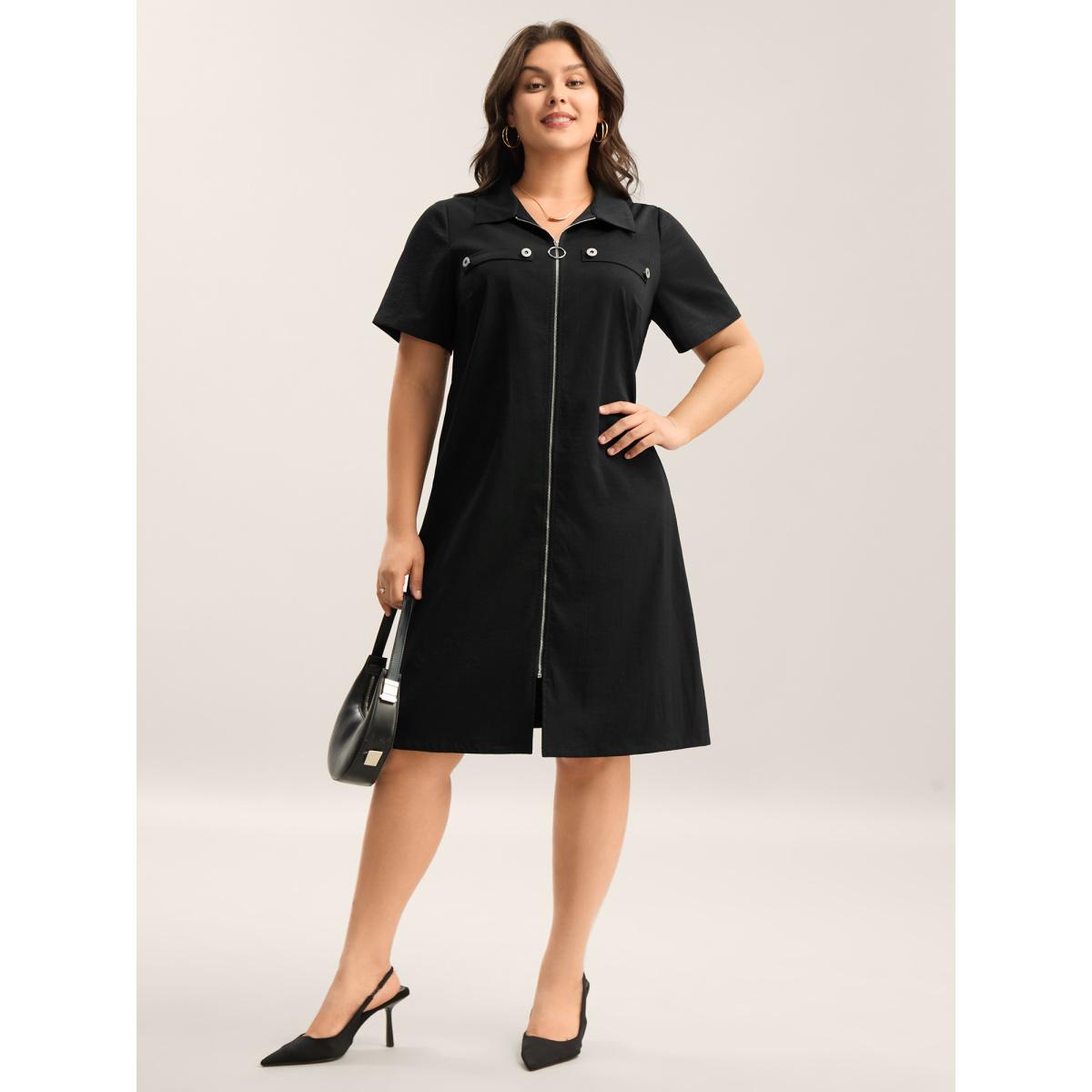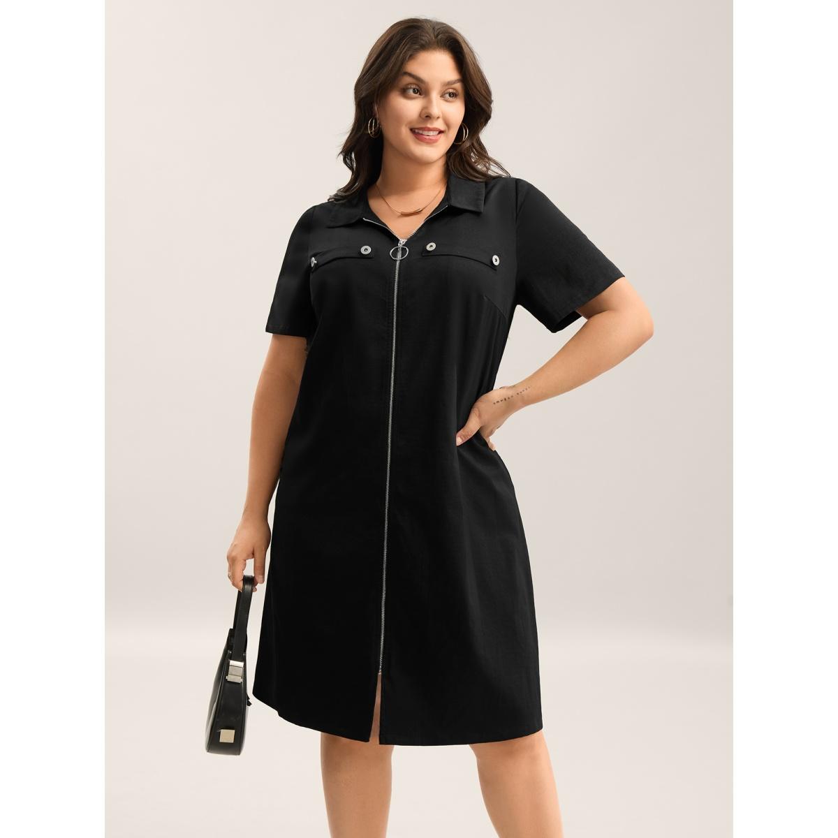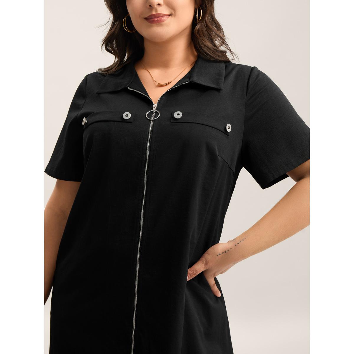 Plus Size Zipper Front Chest Flaps Shirt Dress Black Women Shirt collar Short sleeve Curvy BloomChic 26/4X Product Image