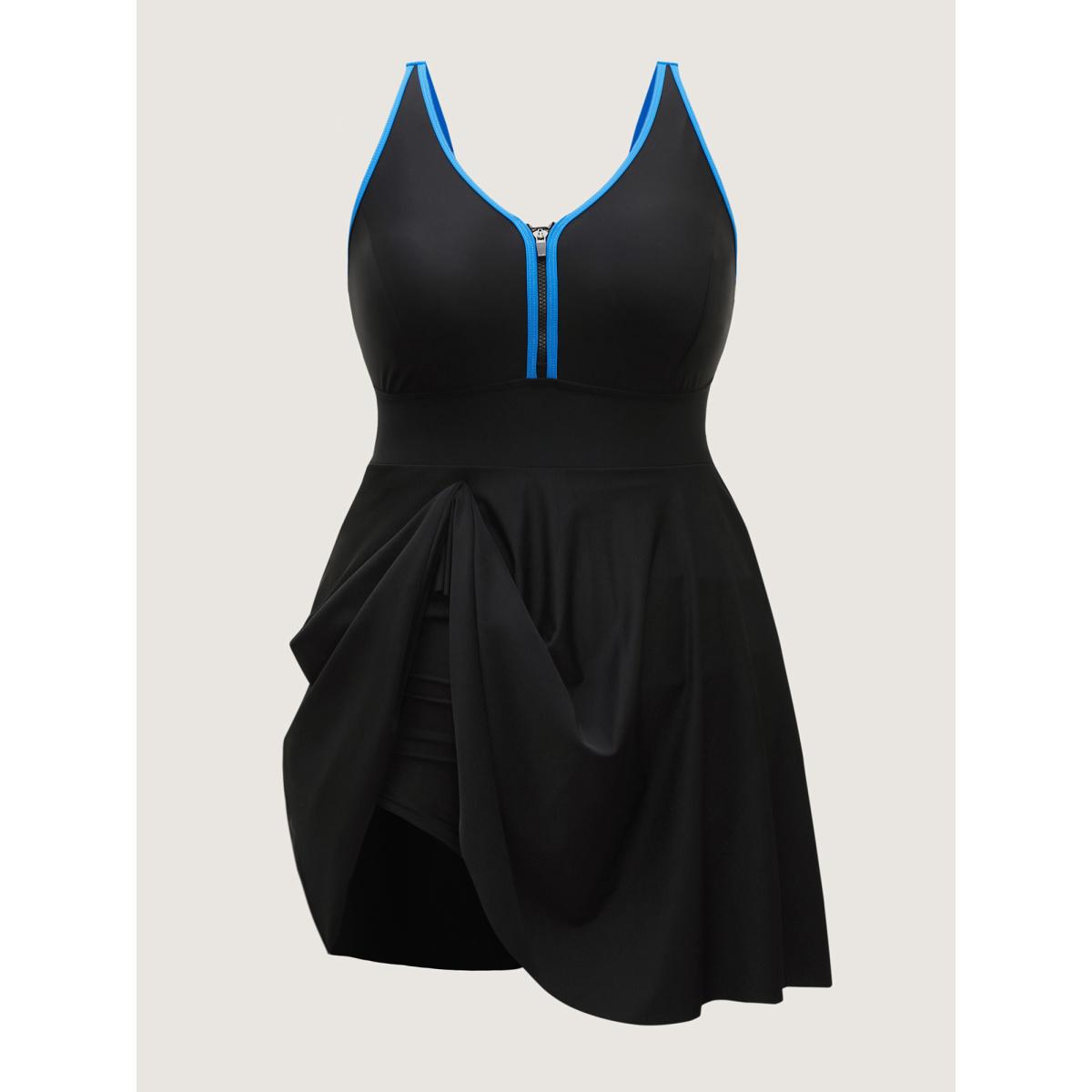 Plus Size Zipper Front Color Contrast Swim Dress Women's Swimwear Black Resort Bodycon V-neck High stretch Curve Swim Dresses BloomChic 10/M