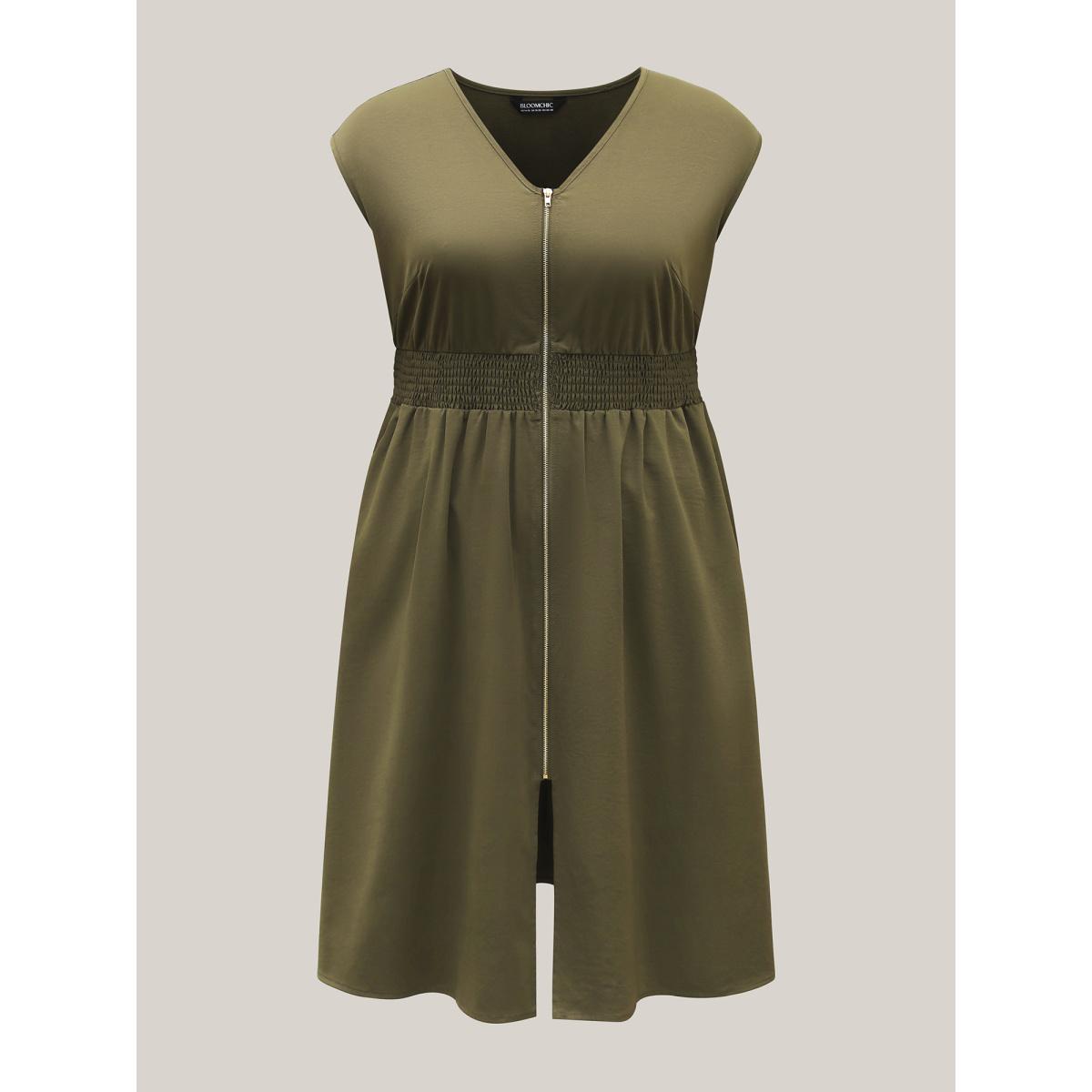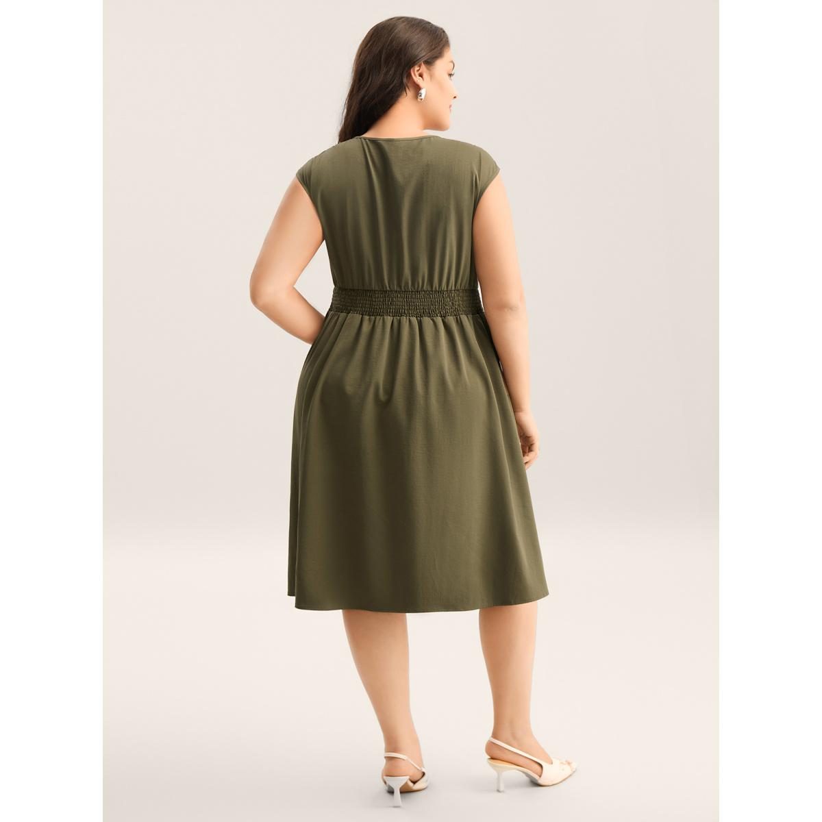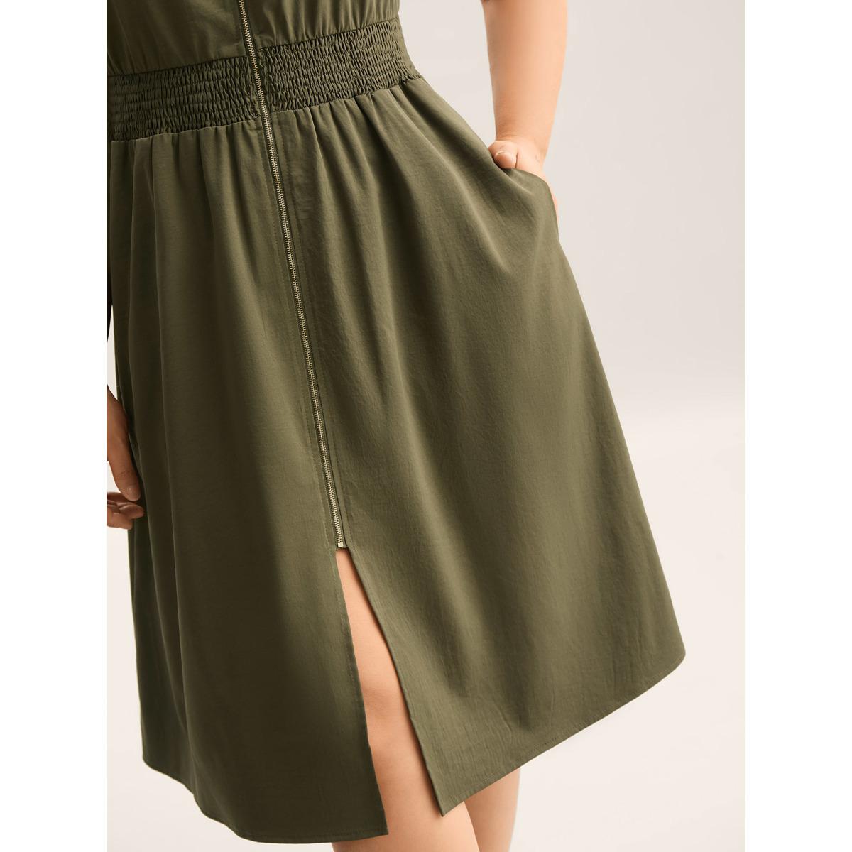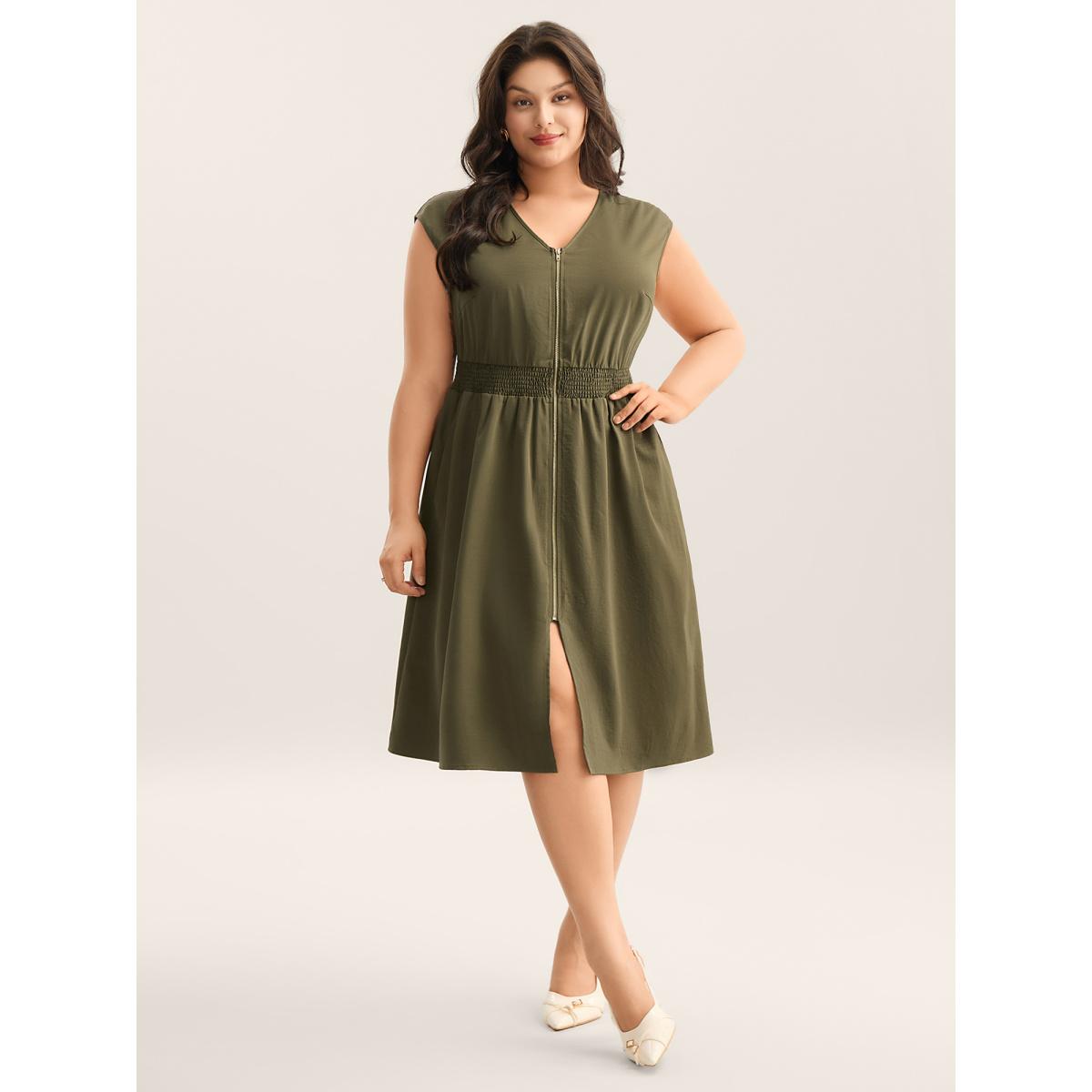 Plus Size Zipper Front Woven A-Line Midi Skirt ArmyGreen Women V-neck Cap Sleeve Curvy BloomChic 22-24/3X