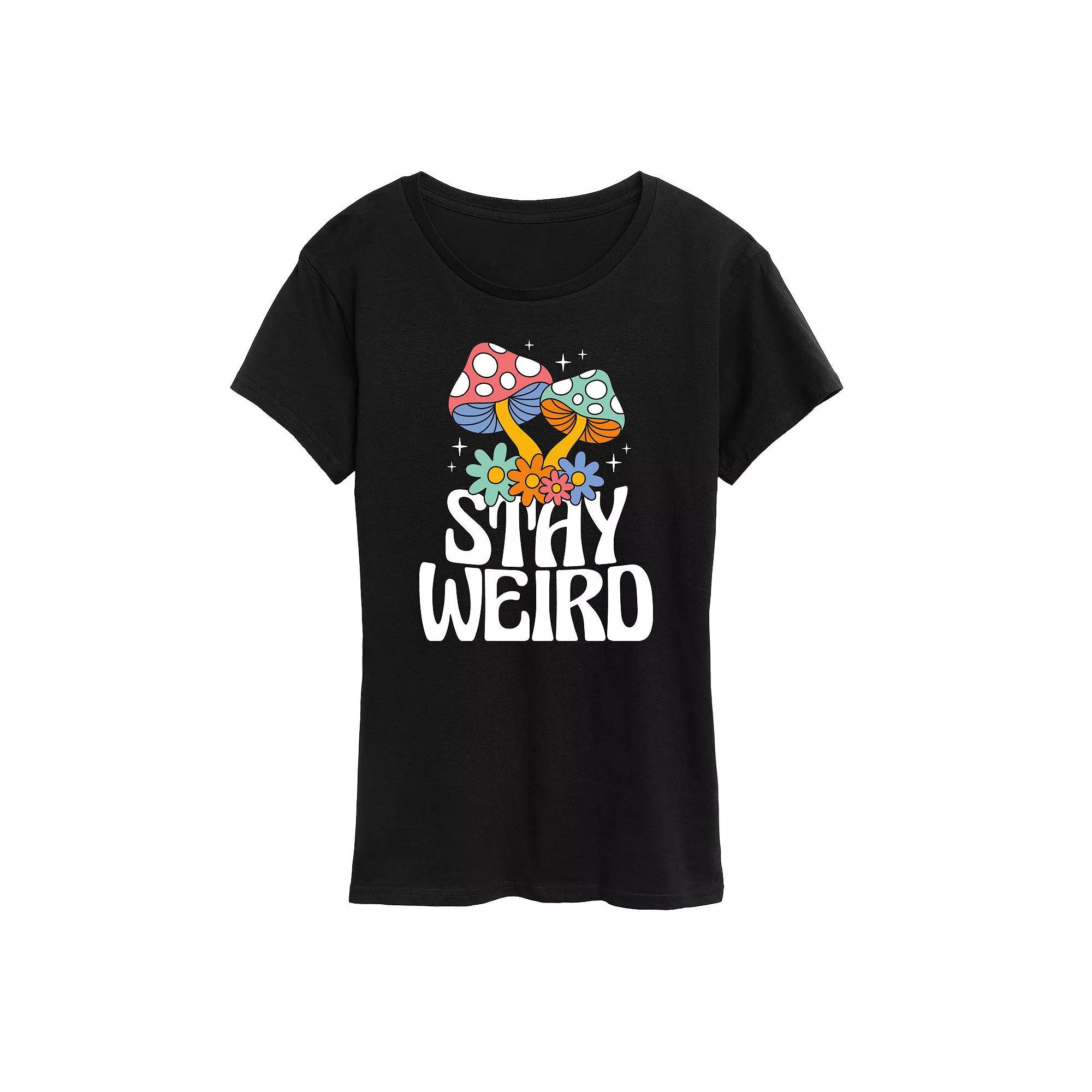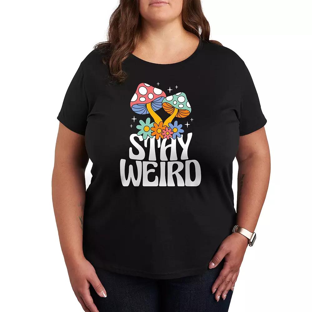 Black Stay Weird Mushrooms Graphic Tee - Women, Juniors, Plus & Petite Plus. Tee featuring breathable fabric, a relaxed fit and fun graphic.Full graphic text: Stay weird.Size S: 26 long from high point of shoulder to hemSize & fit: Relaxed-fit garment with a slightly longer hem. Fits true to size.100% cottonMachine wash; tumble dryImported, screen printed in the USA