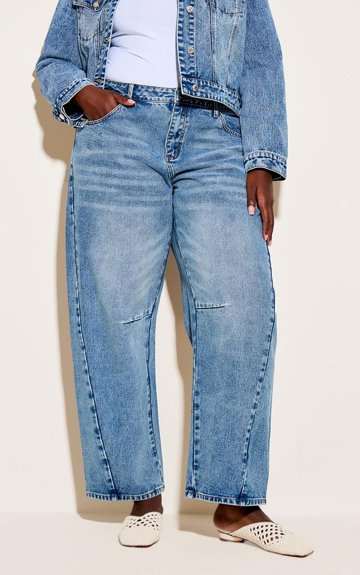 Make a confident statement with denim that speaks for itself. The plus vintage seam detail low rise barrel jeans arrive in a cool vintage wash, featuring a modern low-rise waist that secures with a classic button and zip fastening. Their distinctive barrel cut offers a relaxed leg, tapering subtly at the ankle, expertly shaped by artful seam detailing on the front. Style yours with a sleek cropped cami and fresh sneakers for an effortlessly cool day look, or pair with a fitted sweater and heeled mules to elevate your off-duty aesthetic with discerning confidence.Length approx 86.5cm/34inch (Based on sample size US 12)Model wears size UK 16/ EU 44/ AUS 16/ US 12Model Height - 5ft 9inchp]:!mb-4inch>Brand: PrettyLittleThingCategory: DenimProduct type: JeanColor: VintageMaterial: Rigid DenimDesign: PlainOccasion: Day