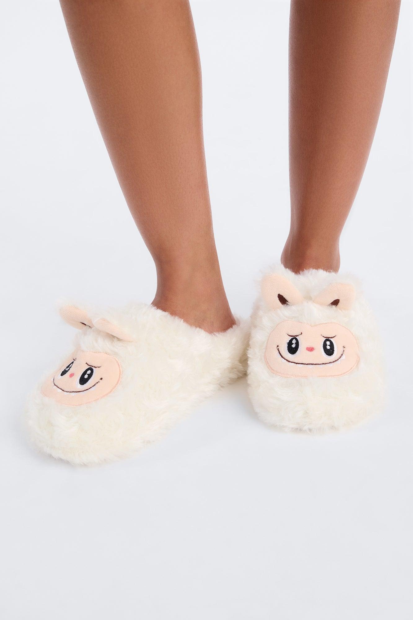Available In Cream And Pink. Closed Toe Slippers Faux Fur Monster Face Print Ears 3D Applique Round Toe Flat Heel Imported California Proposition 65WARNING: Cancer and Reproductive Harm - www.P65Warnings.ca.gov.