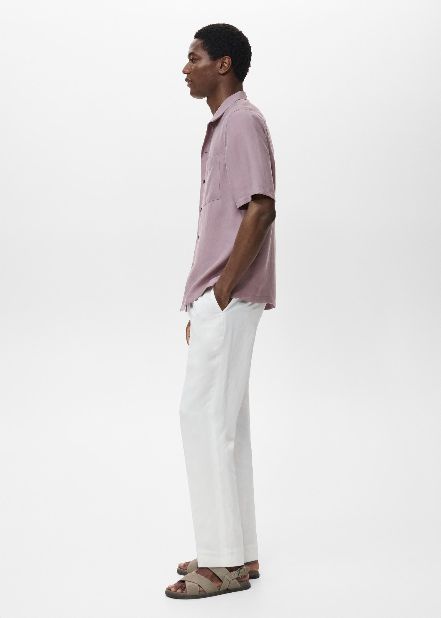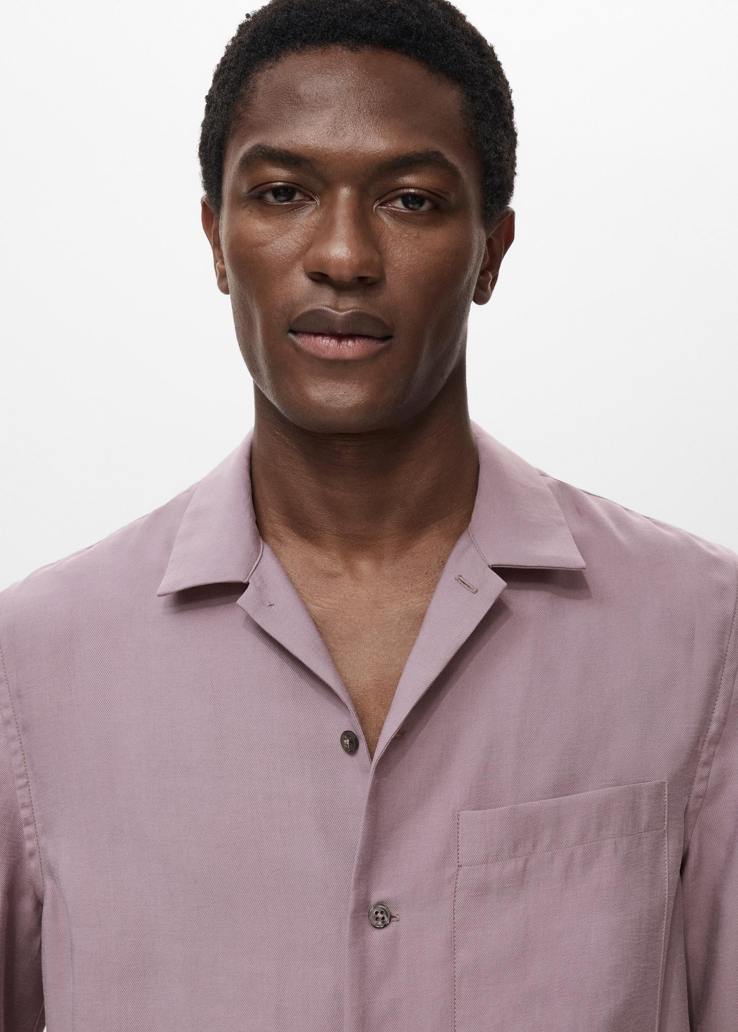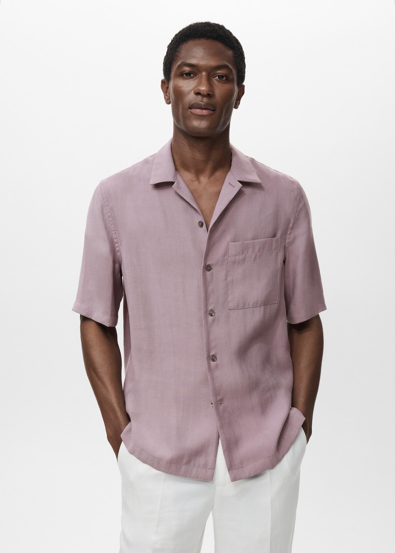 Lyocell fabric. Regular fit. Bowling collar. Patch pocket on the chest. Front button closure. Short sleeve. Model is 190 cm and wears size M. Back length 29.92 in