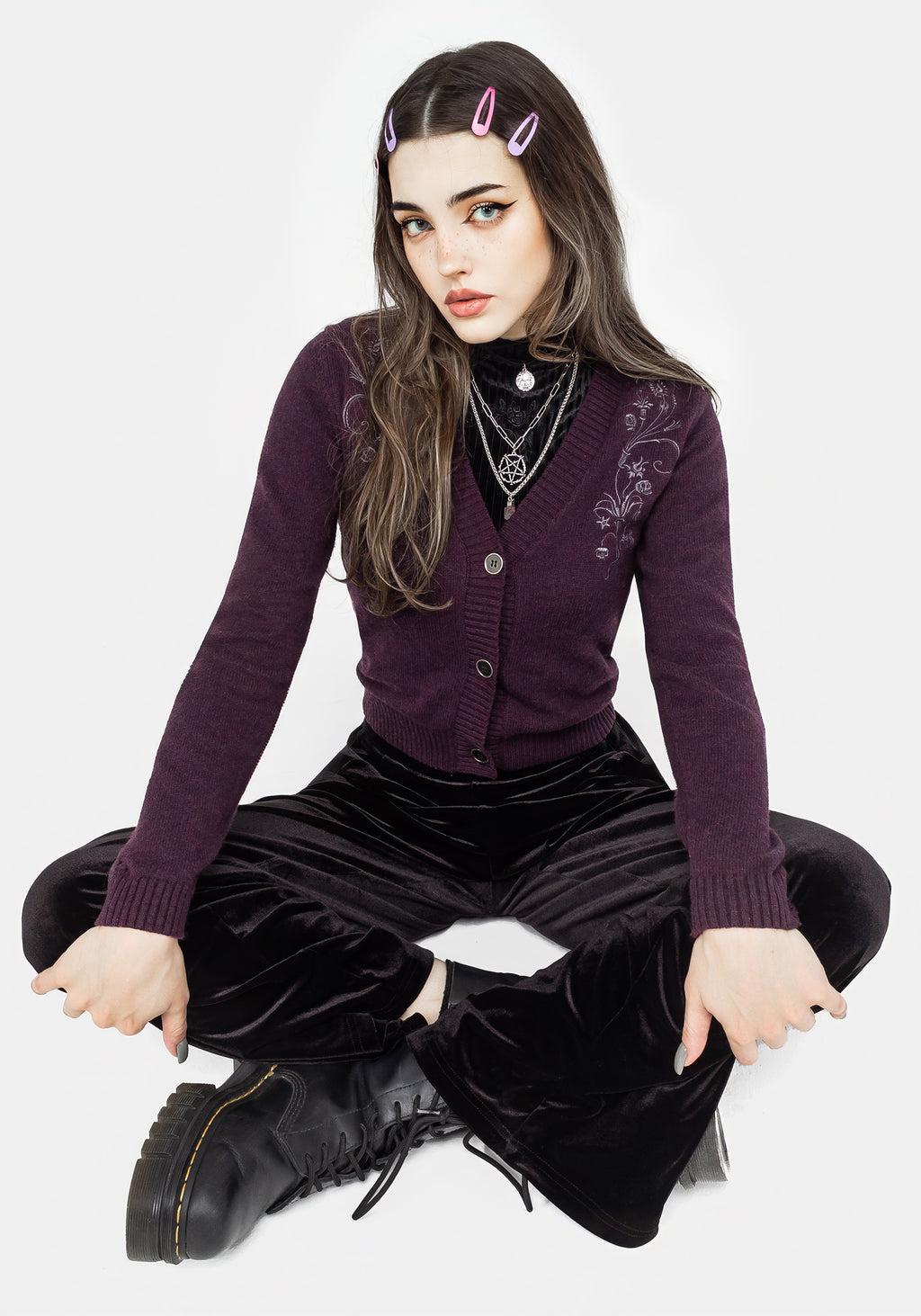 All that we see or seem is but a dream within a dream- Deep purple embroidered crop cardigan - Long crop fit pairs perfectly with high-waisted bottoms & dresses alike - Soft ribbed V-neckline & cosy long sleeves - Fastens with cool gunmetal buttons at front - Soft, dimensional warm-toned dark purple knit fabrication - Cool, blue-toned grey floral skull embroidery on lapel - Add a muted pop of colour to your darkest ‘fits - Dramatic at heart 60% cotton, 30% nylon, 10% woolLiubov is 5'6" and is wearing a Size S