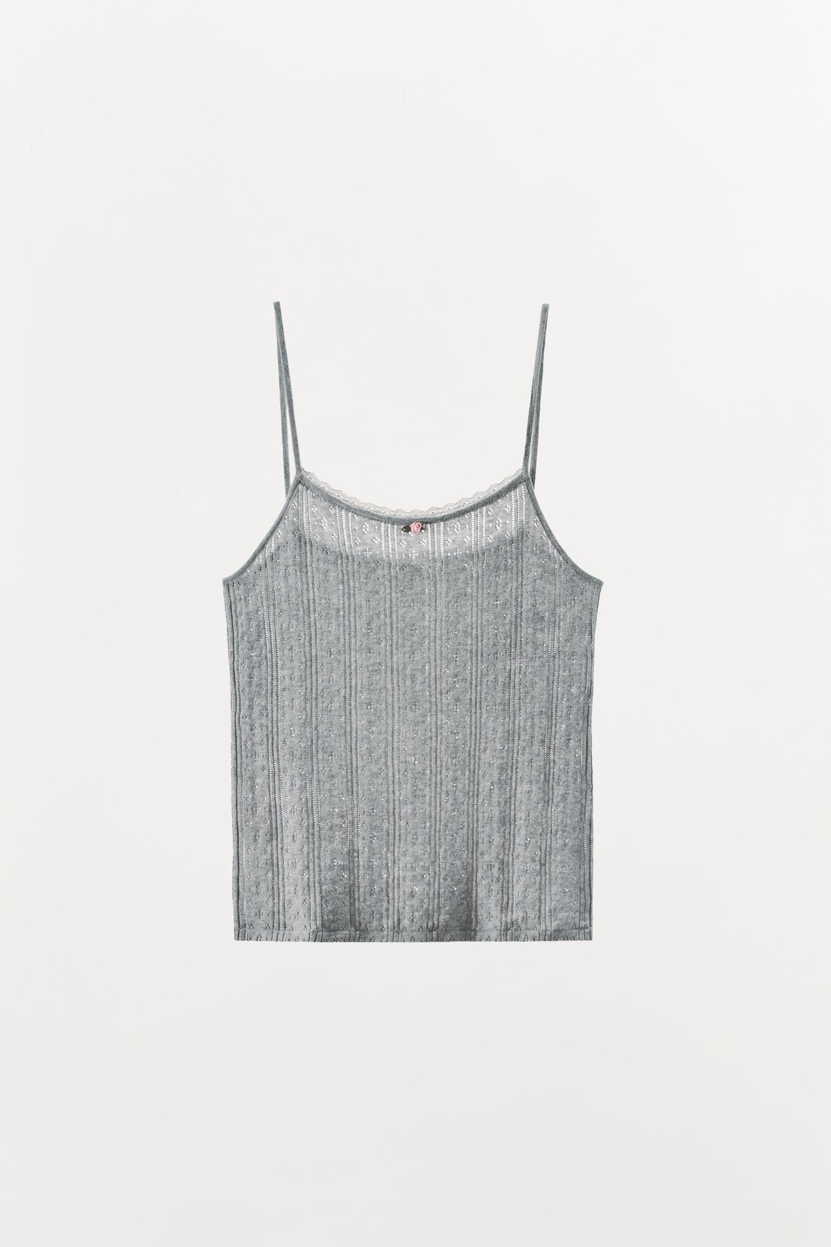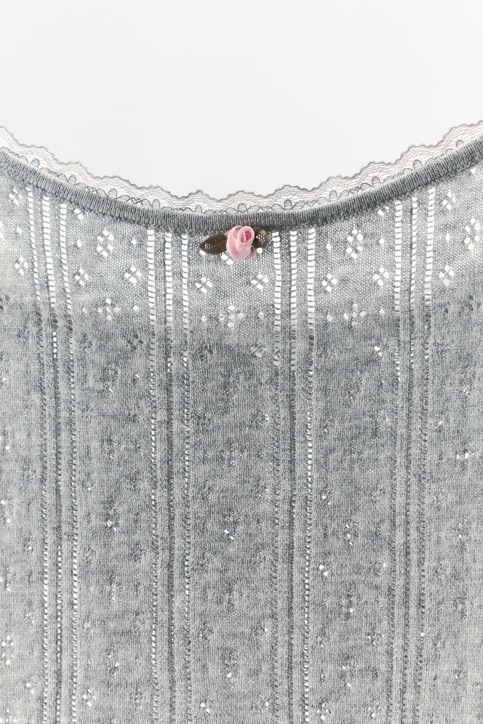 Top made of 100% cotton yarn. Round neckline and spaghetti straps. Contrasting floral appliqué detail on the chest.