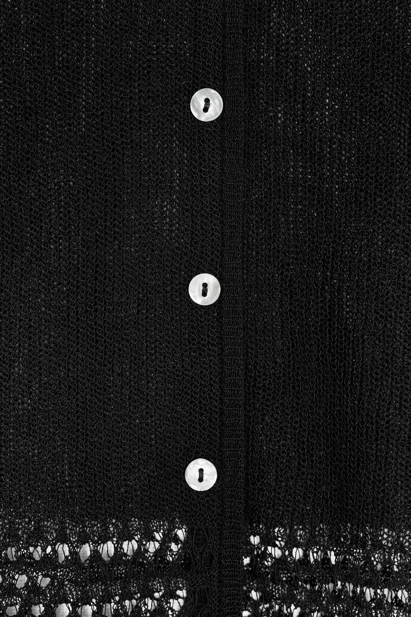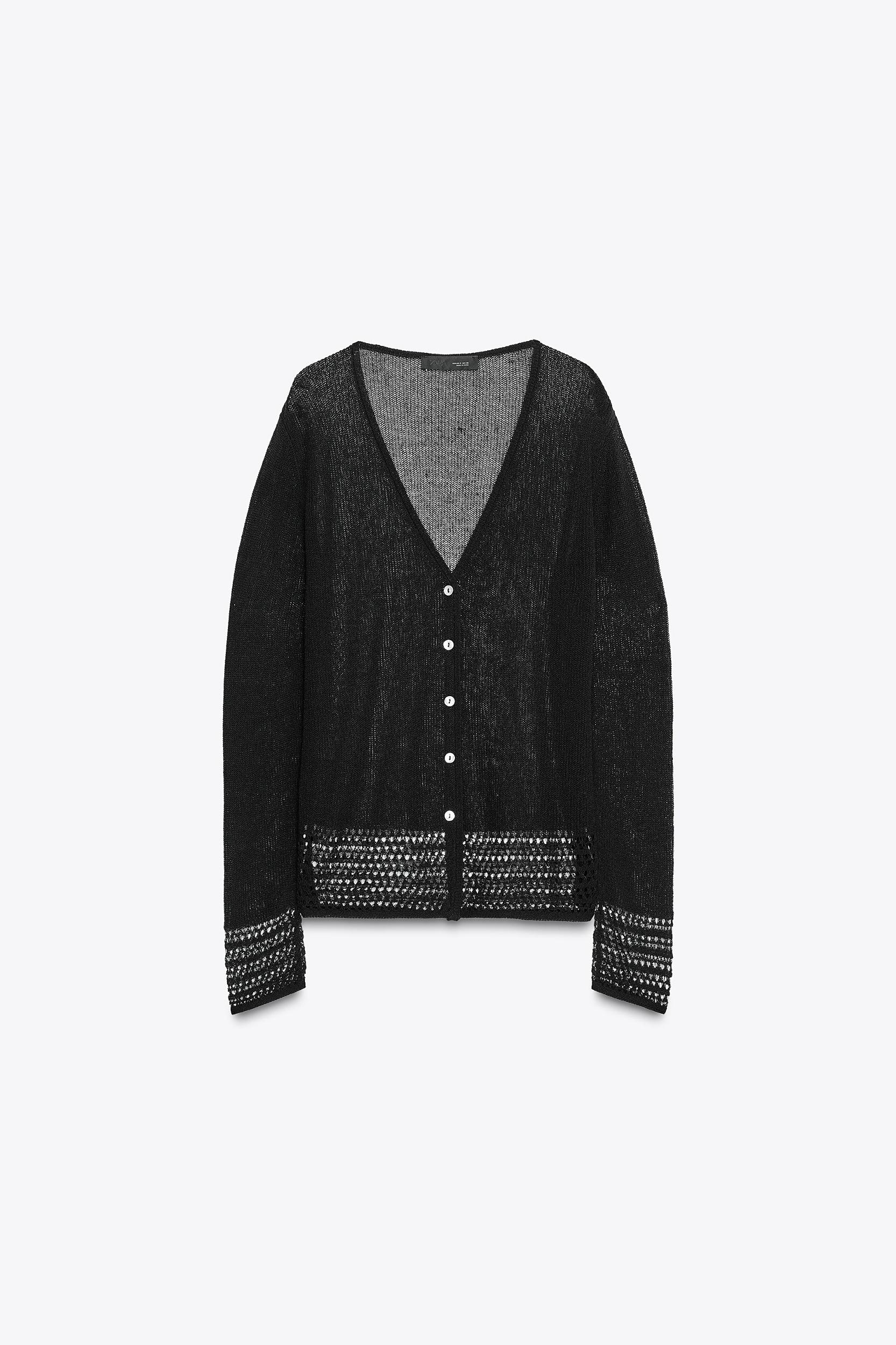V-neck cardigan with long sleeves. Open knit hem. Front button closure.