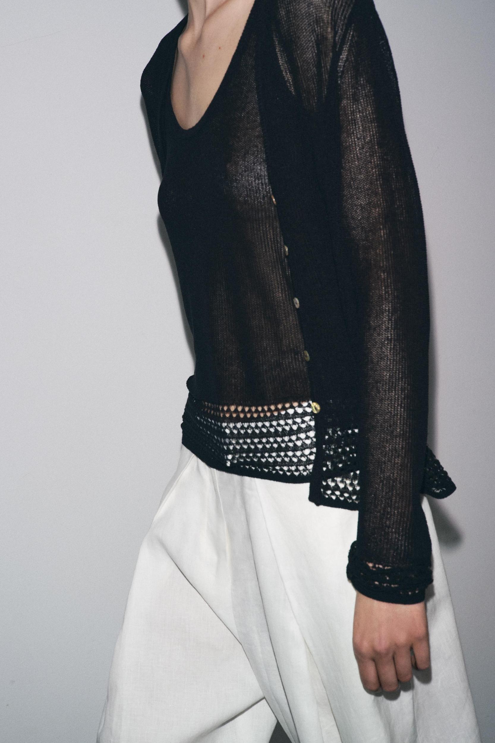 LONG SLEEVE POINTELLE STITCH V NECK CARDIGAN