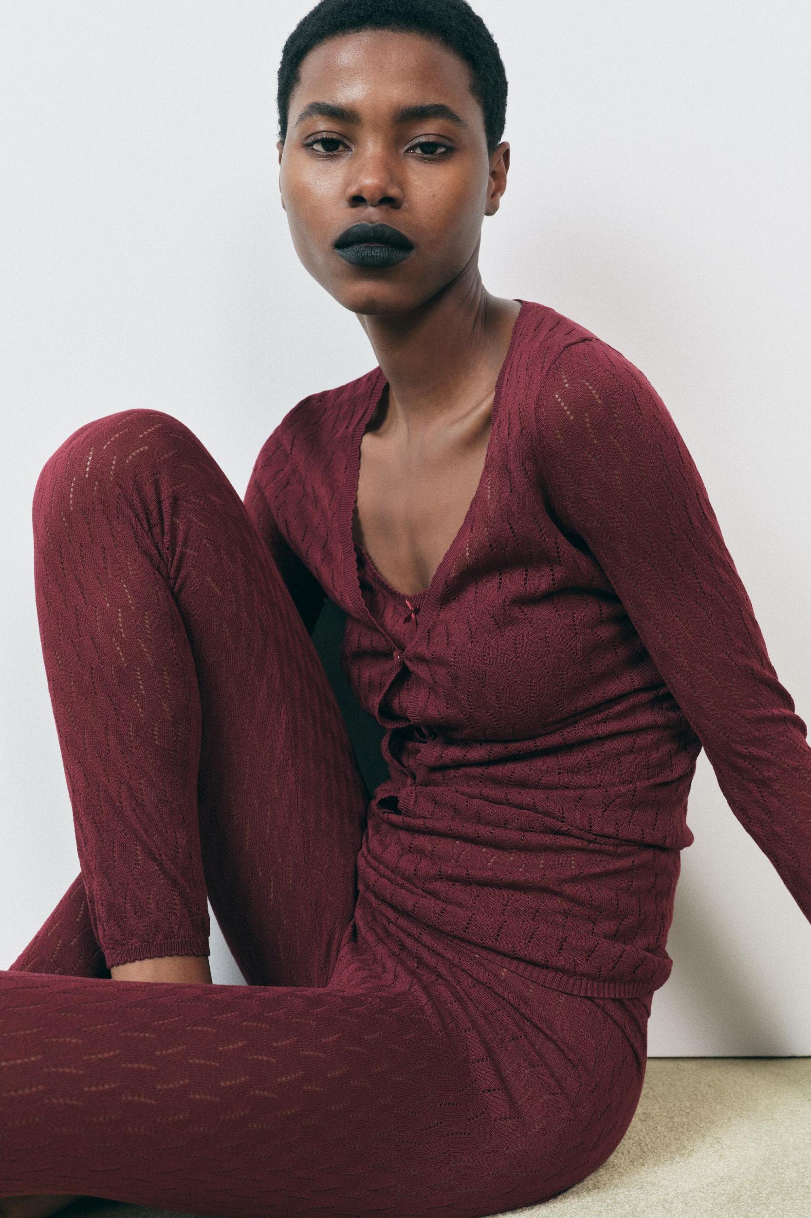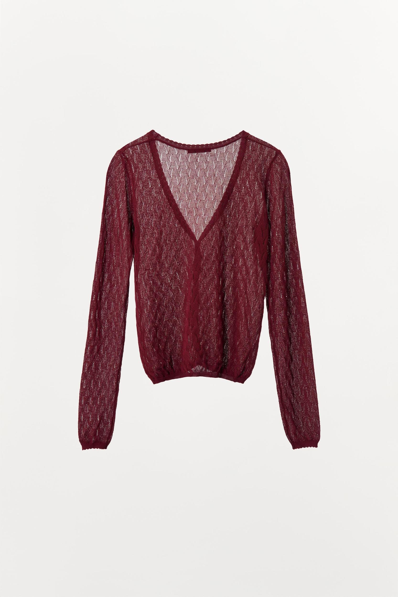 Cardigan with V-neckline and long sleeves. Tonal matching knit fabric detail. Front closure with lined buttons.