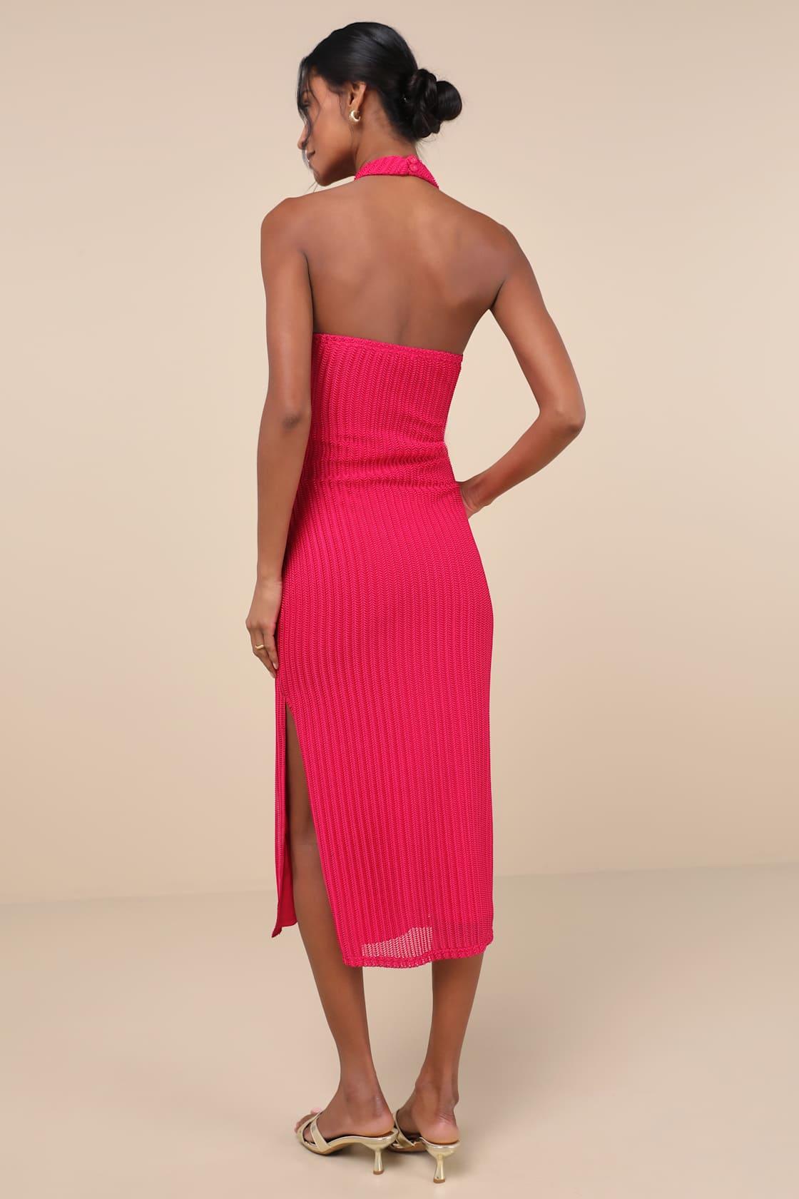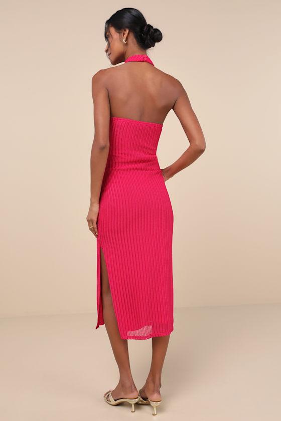 Everyone will be asking about the cool and confident cutie in the Lulus Poised Attitude Berry Pink Halter Cutout Twist-Front Midi Dress! Slinky textured knit has a shiny effect as it forms a halter neckline (with twin loop-button closures) and a sexy bodice with an open back, a twisted design at the front, and twin cutouts at the waist. Figure-skimming skirt continues down to a midi hem with a sultry side slit. Elastic at back for fit.