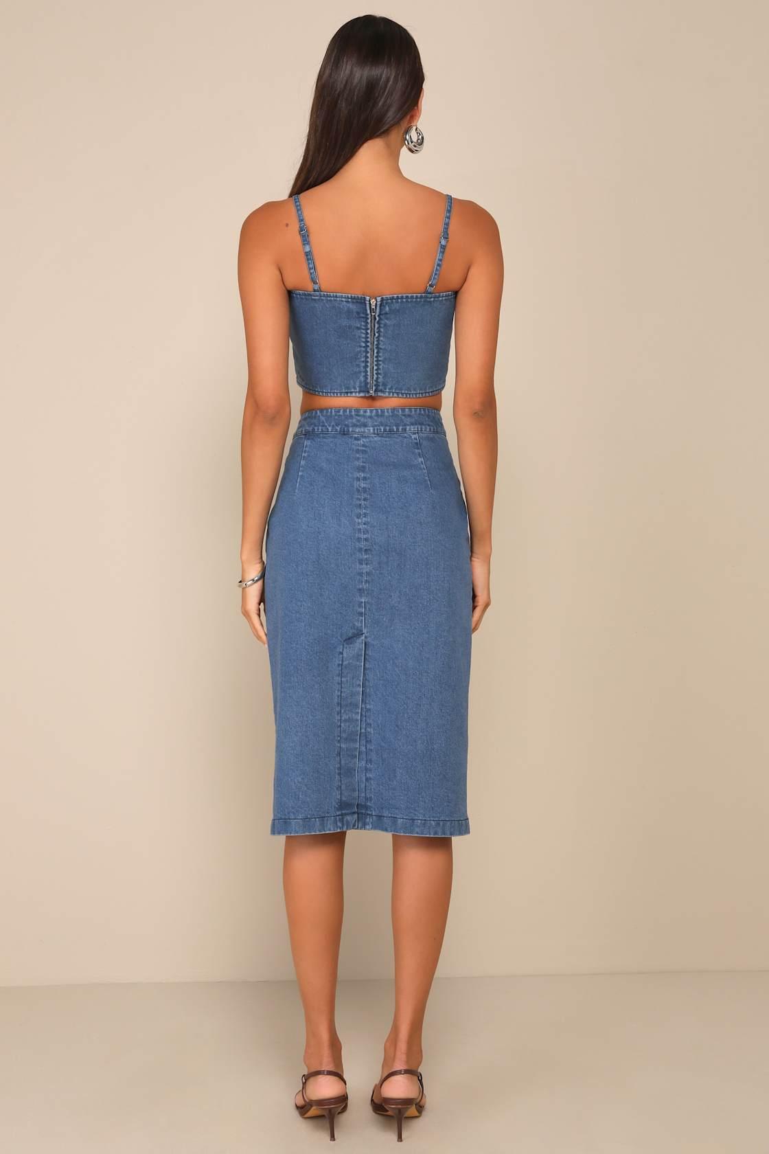 Set yourself up for a summer full of compliments with the Lulus Poised Pairing Medium Wash Denim Two-Piece Midi Dress! Slightly stretchy, cotton-blend denim shapes this trendy two-piece dress that starts with a cropped top with princess-seam details, a simple straight neckline, and adjustable spaghetti straps. Exposed silver zipper at the back. The matching midi skirt boasts a high, banded waist with a top button closure and hidden zip fly, along with a figure-skimming column silhouette. Kick pleat at the back.