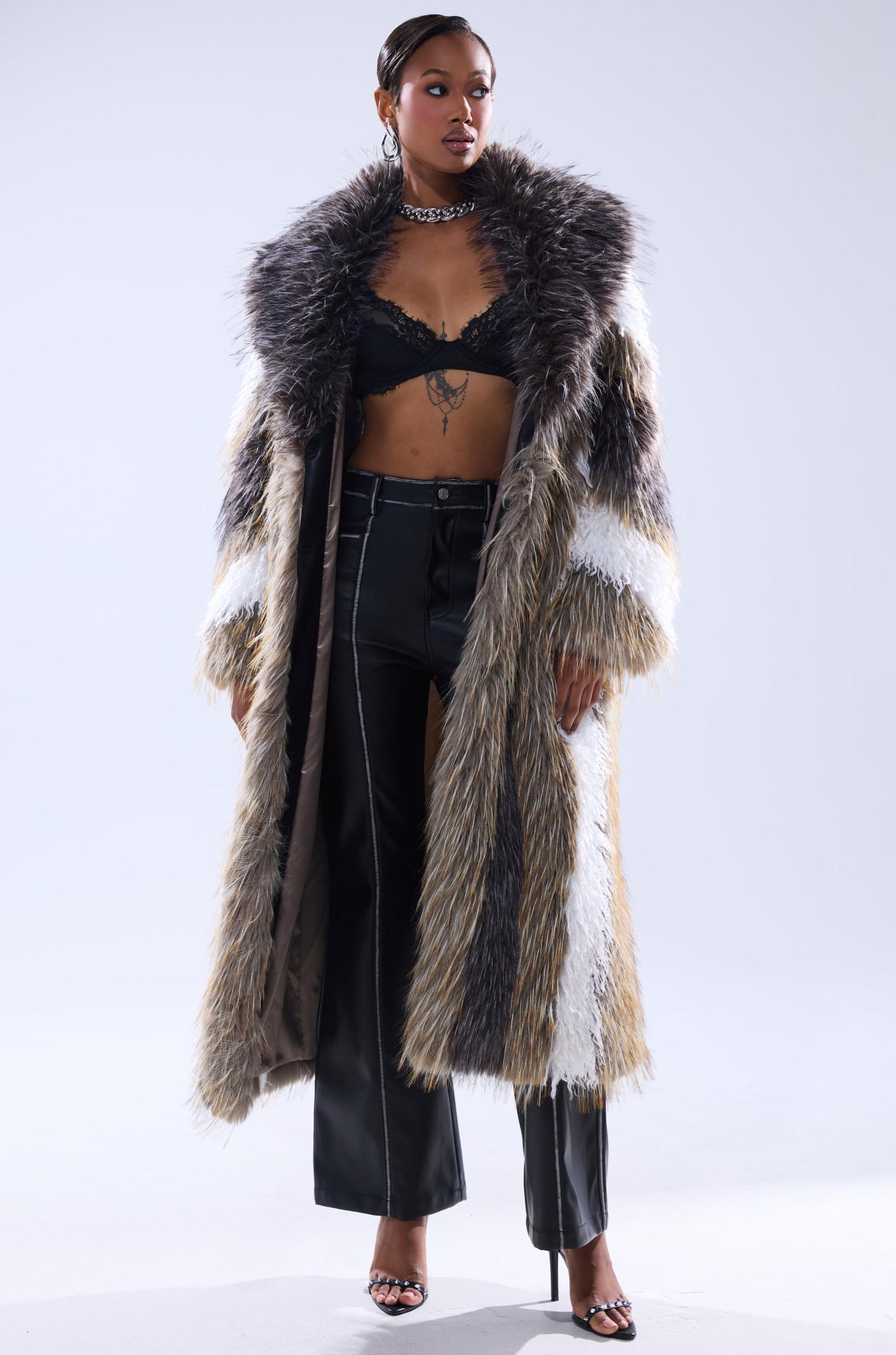 The AKIRA Label Poison Ivy Faux Fur Coat is a striking, full-length statement piece crafted for those who love bold luxury. Designed from ultra-plush, tri-tone faux fur, this coat features a dramatic oversized lapel collar, long sleeves, spacious side-seam pockets, and silky satin lining. Cut in a relaxed, oversized silhouette with concealed hook-and-eye front closures, this coat drapes beautifully over everything from sleek trousers to body-hugging dresses. - Shell: 100% Polyester, Lining: 100% Polyester- Dry Clean Only- No Stretch- Imported (all measurements approximate from size S/M)- 50” Shoulder to Hem- 16” Shoulder to Shoulder- 23” Sleeves- Model is 5’9” and wearing a size S/MProduct ID: 1067595