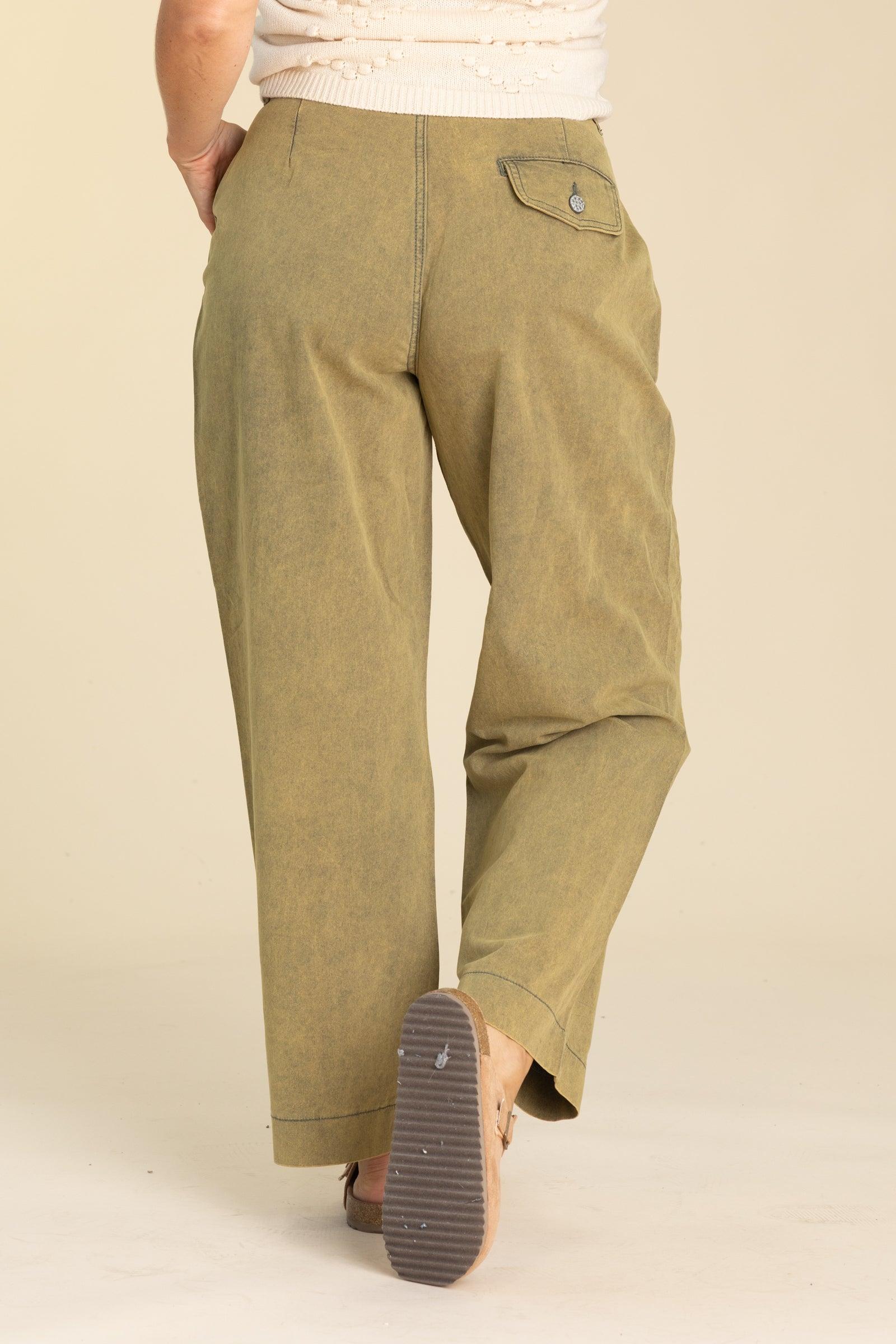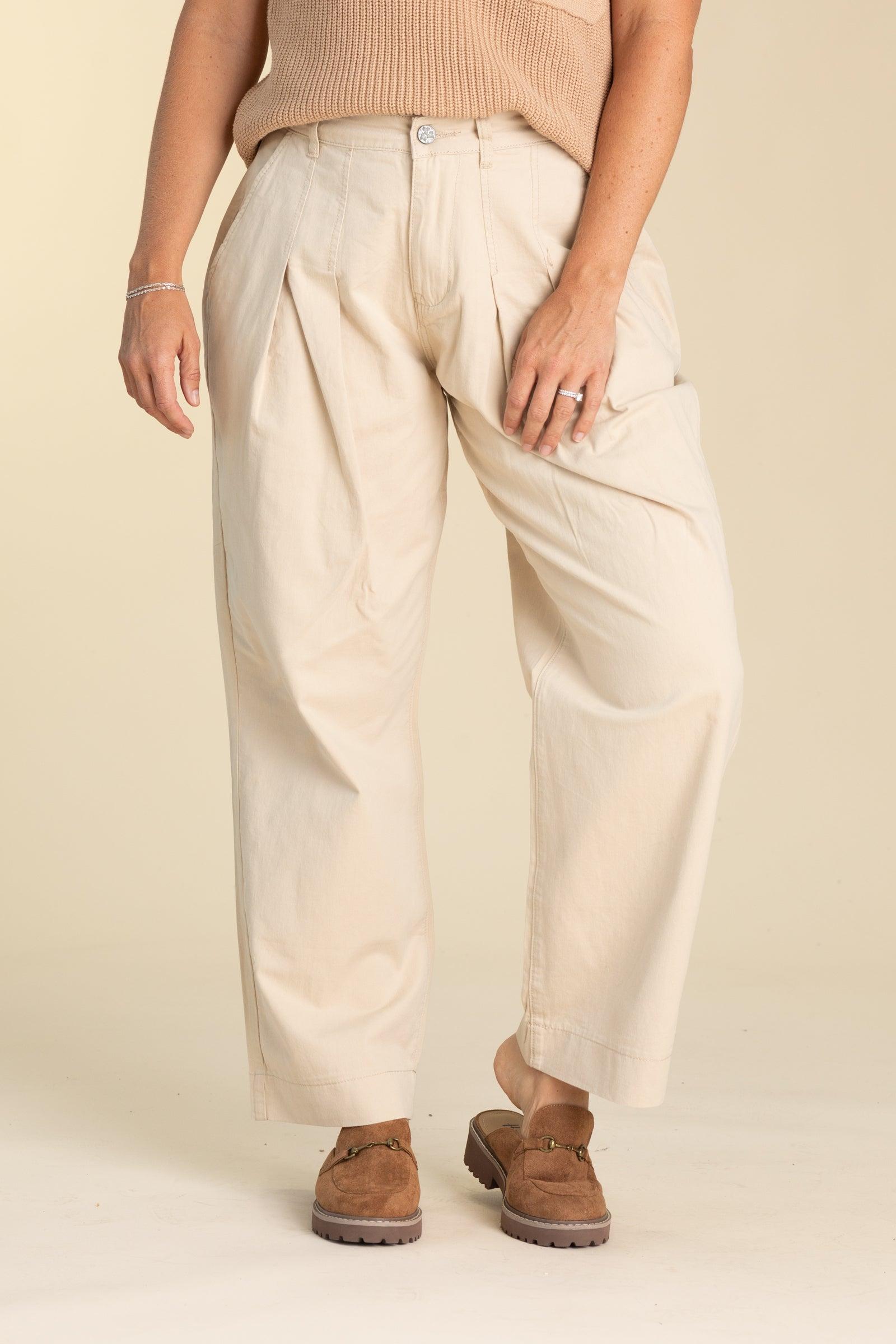Product Details Colors: Beige/ Olive Print: Solid Style: Pleated Brand: POL Material and Care 100% Cotton Hand Wash Cold Line Dry Size and Fit These pants have no stretch in the waistband or legs Small: Waist 30" Rise 12" Inseam 28.5" Medium: Waist 32" Rise 12.5" Inseam 28.5" Large: Waist 34" Rise 13" Inseam 28.5" Erica is 5’7” and wearing her true size medium
