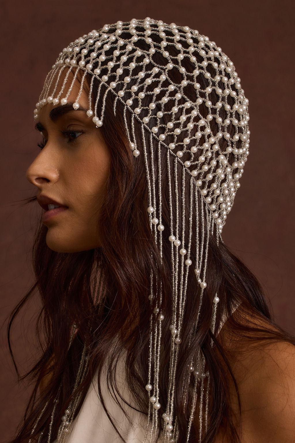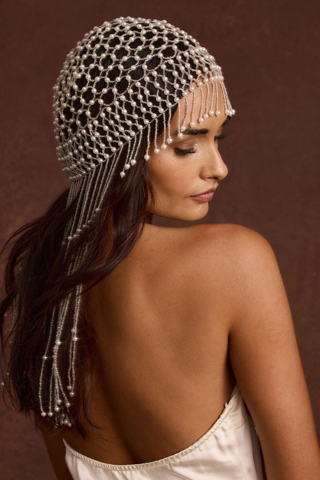 You're a cool bride, rock the Polina Pearl Headpiece on your day. It's the perfect statement piece for any modern bridal moment or party because your wedding should be cool like you. The elastic flapper cap style pearl detailing is ideal for any outing on your bridal itinerary.**ALL ACCESSORIES ARE FINAL SALE**