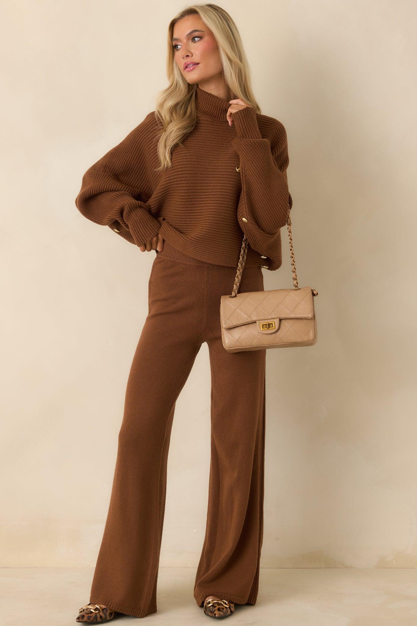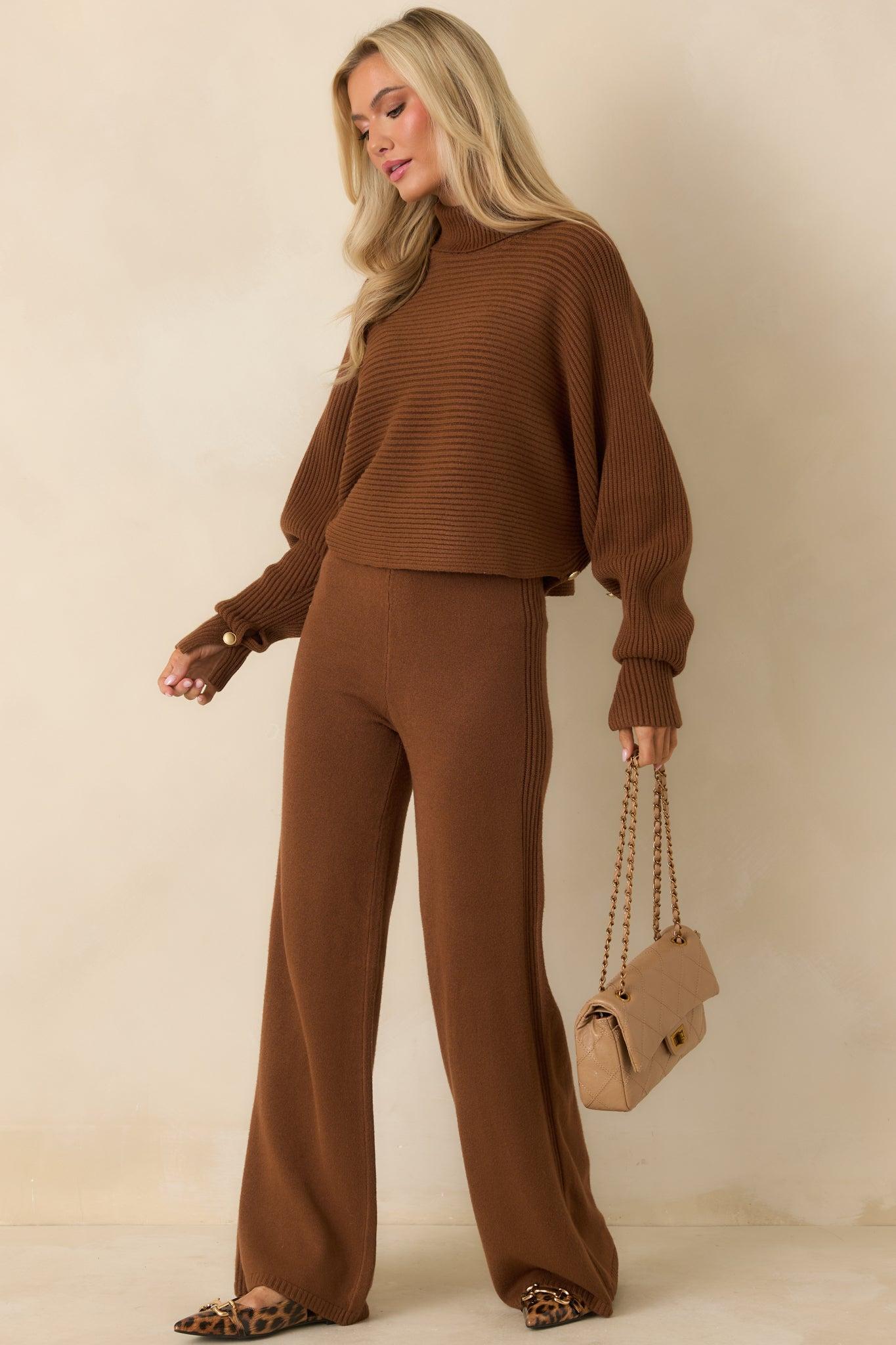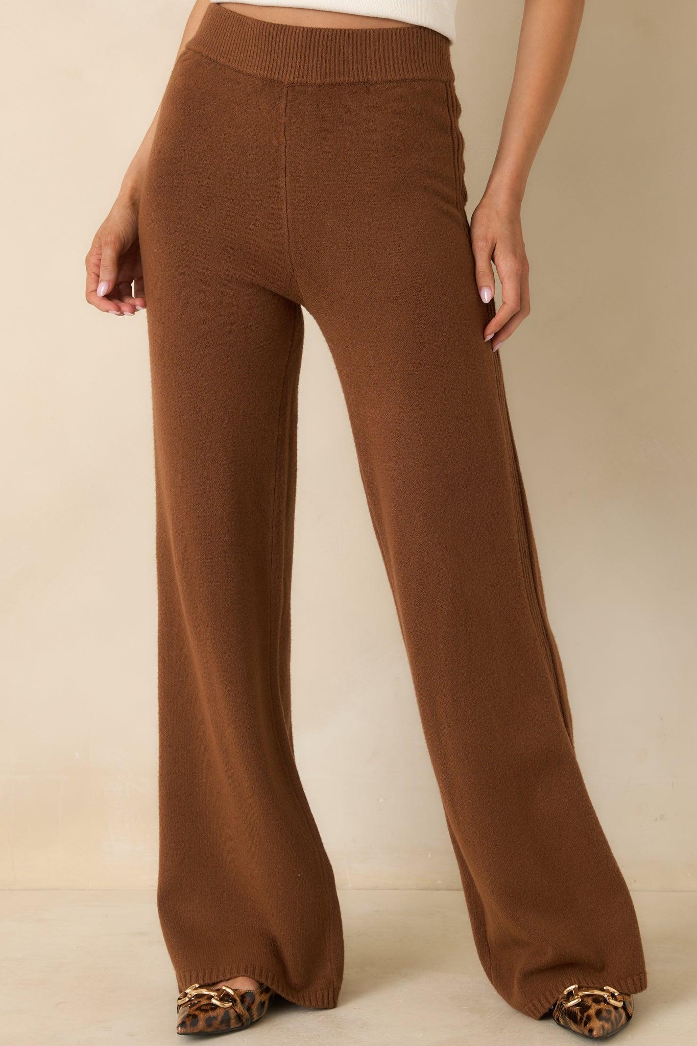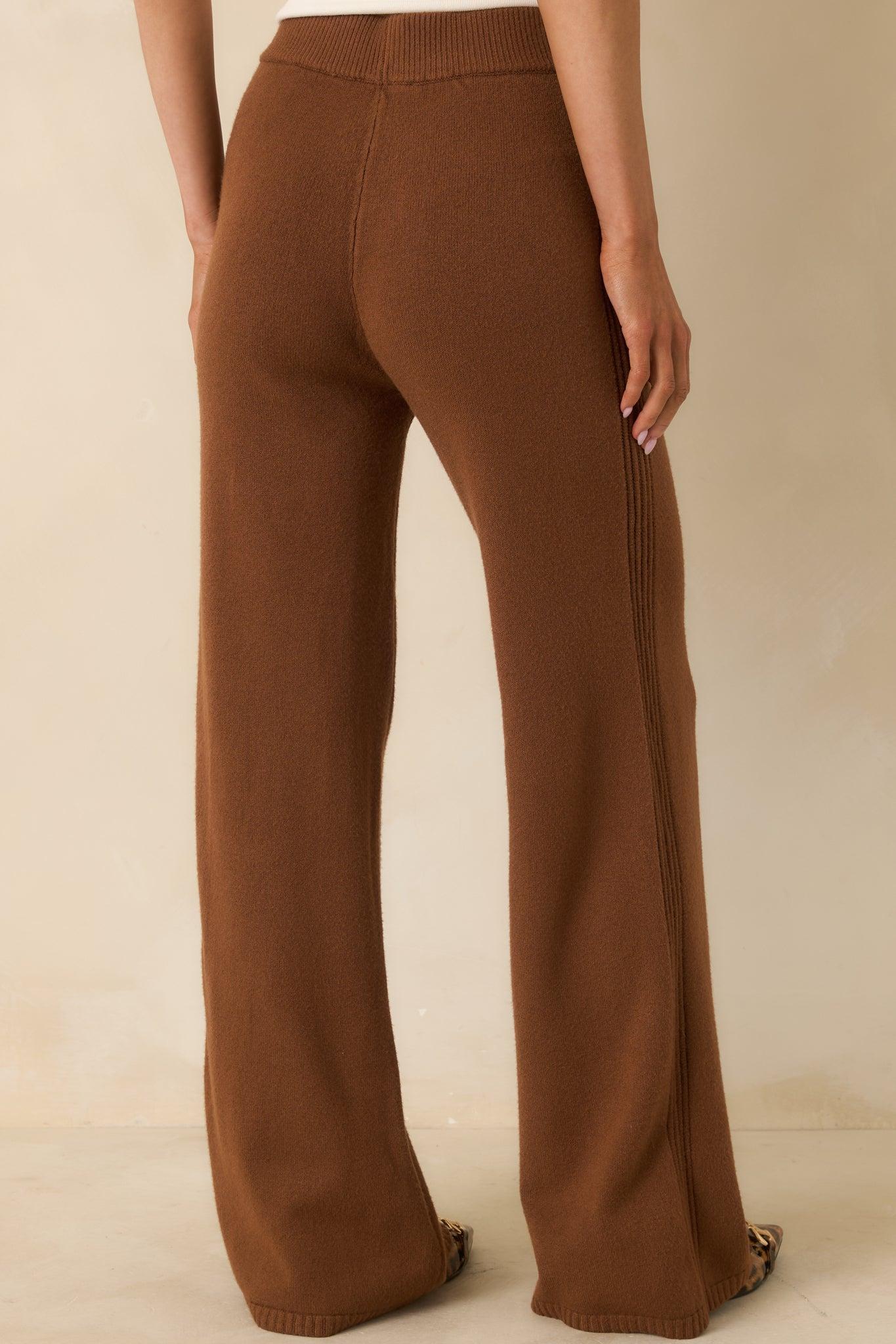 These Polished Path Brown Knit Wide Leg Pants are the perfect balance between comfort and polish. Designed with a smooth fit through the hips and an easy wide leg, they feature subtle ribbed detailing along the sides that adds texture and a refined finish. Effortless to style and easy to wear, they’re a go-to for looking put-together without trying too hard. These brown knit pants are crafted from a soft knit fabric and feature a wide leg silhouette with a comfortable elastic waistband. Designed with a high-rise fit, they fall straight through the leg and include ribbed side detailing for added texture. Finished with a pull-on style and clean seam construction for everyday wear.50% Viscose, 28% Polyester, & 22% NylonUnlinedHand Wash Cold Manufactured in China Designed in The USAModel is 5'8" and Wearing a Size X-Small