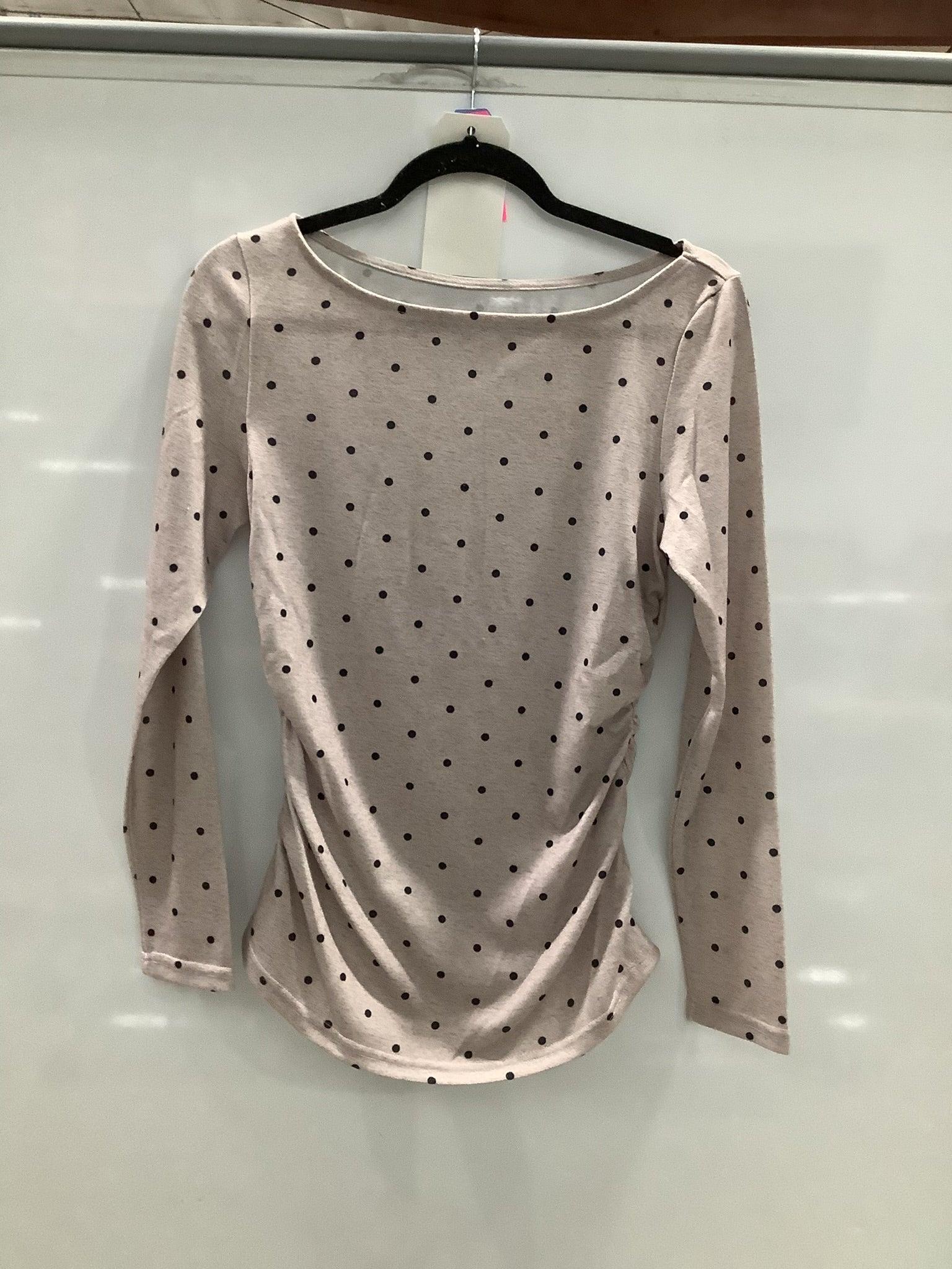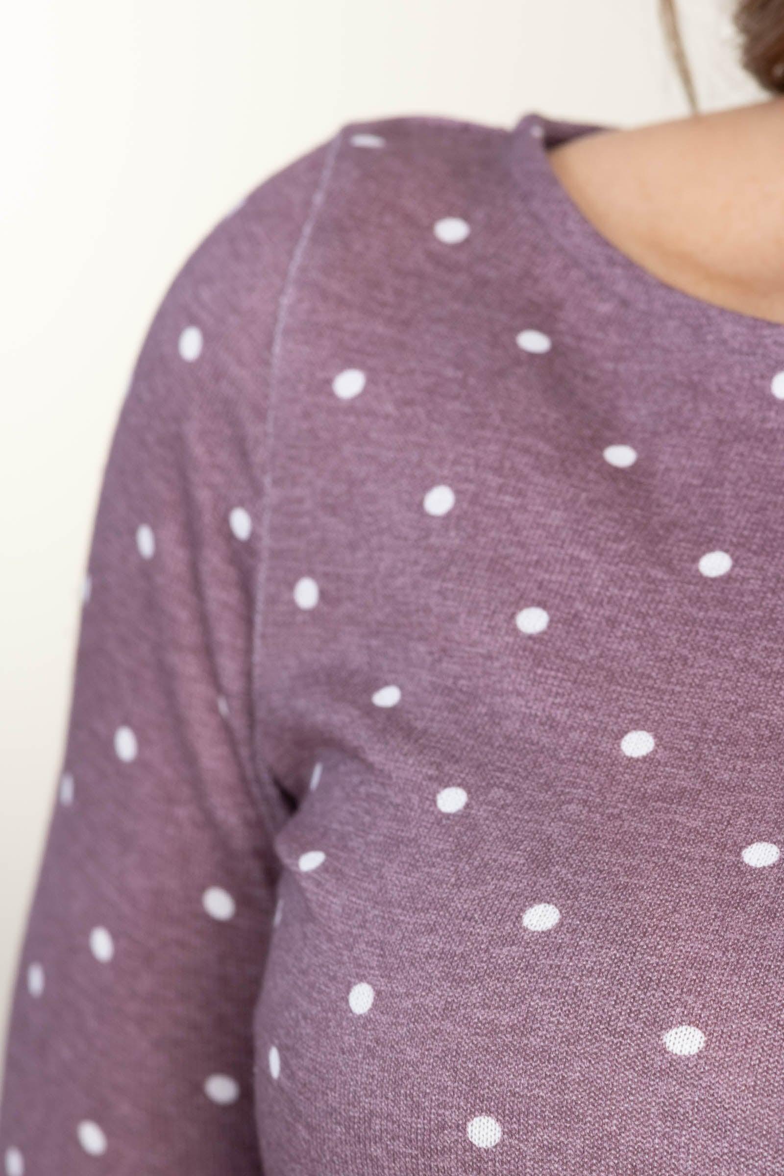 Product Details Colors: Brown, White Print: Polka Dot Neckline: Boat Neck Sleeve: Long Sleeve Hemline: Straight Material and Care 95% Polyester 5% Elastane Machine Wash Cold Tumble Dry Low Size and Fit Small: Bust 32" Waist 28" Length 23.5" Medium: Bust 34" Waist 30" Length 24.5" Large: Bust 36" Waist 32" Length 25.5" X Large: Bust 38" Waist 34" Length 26.5" Erica is 5’7” and wearing her true size small