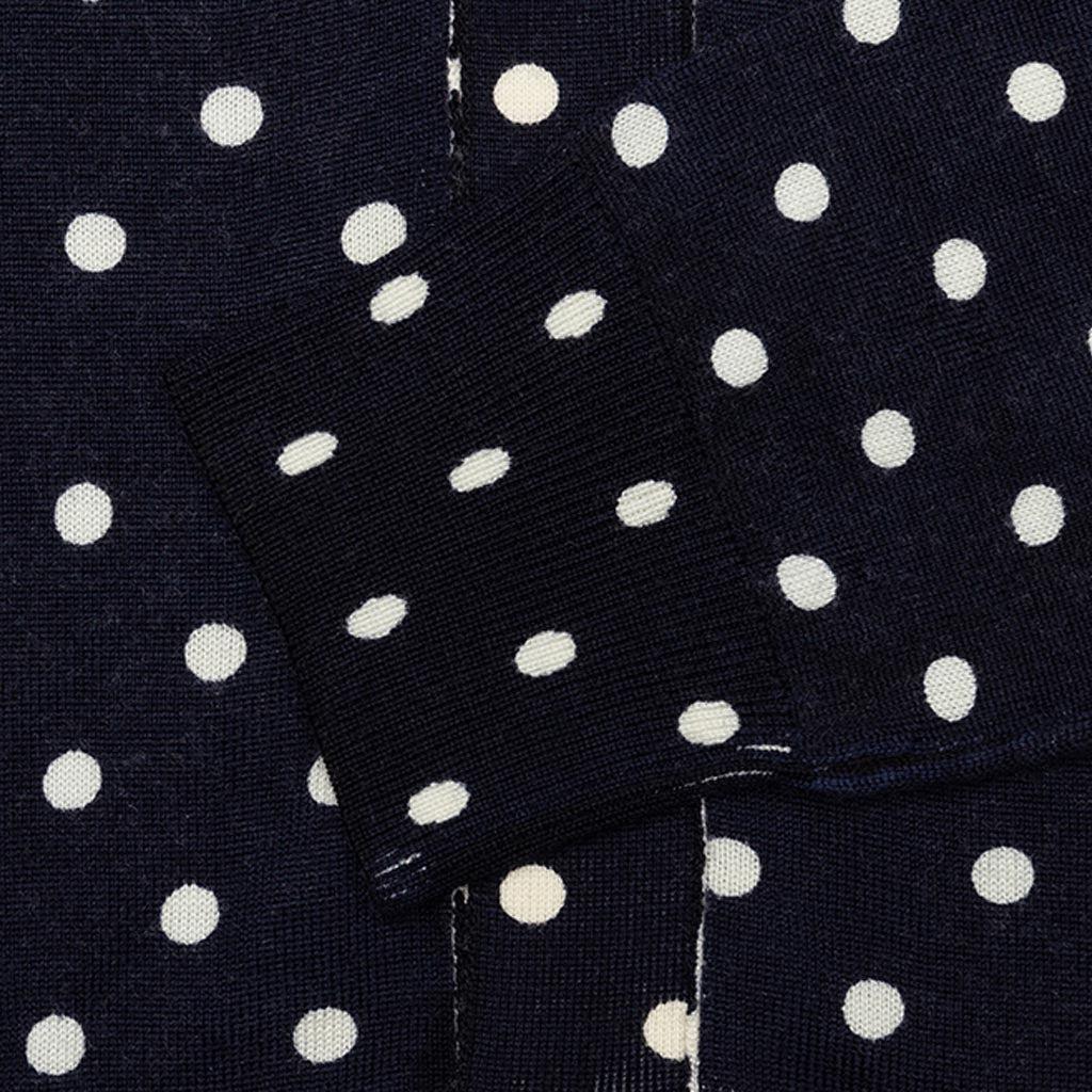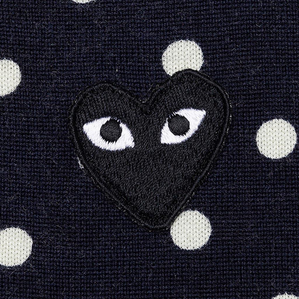 The concept of the Comme des Garcons PLAY line is design by not designing. Characterized by the iconic red heart logo designed by artist Filip Pagowski, the line is a collection of unisex basics, fragrances, and footwear for those who enjoy simplicity. Pictured is the Comme des Garcons PLAY Polka Dot Cardigan Black Heart in Navy. AZ N038 051 2 COMME DES GARCONS PLAY APPAREL HAS A SMALLER FIT, WE RECOMMEND SIZING UP. 100% Wool Embroidered branding Ribbed edges Made in Japan Style no: AZ-N038-051-2