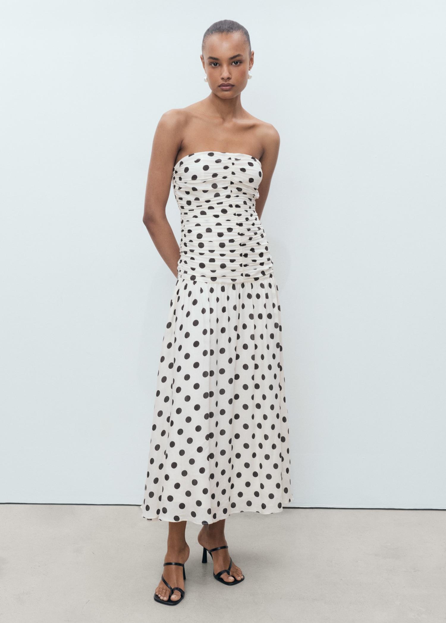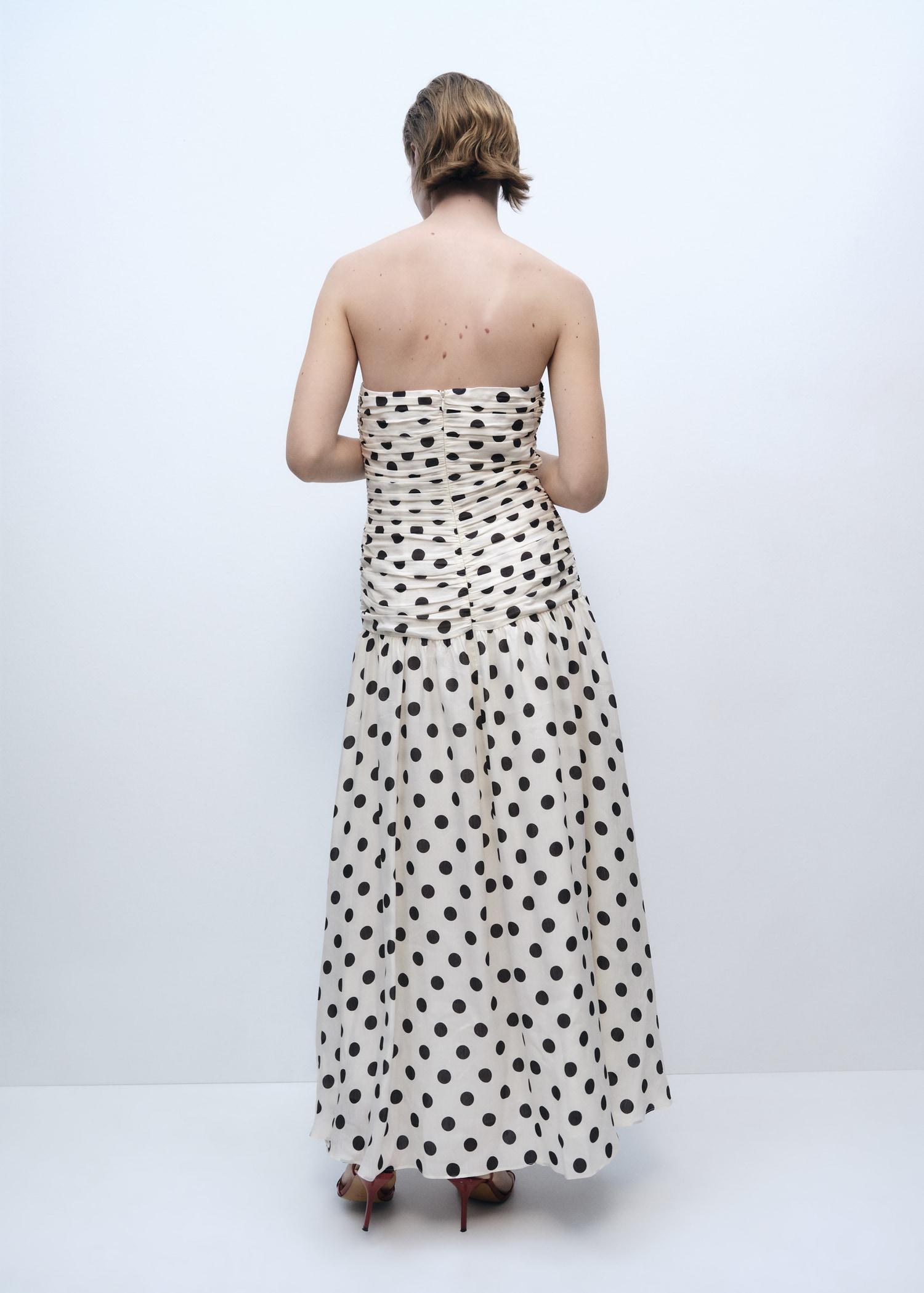 Linen blend fabric. A-line design. Long design. Polka dot print. Shaved design. Strapless. Sleeveless. Back zipper closure. Exclusive Online. Side length 45.47 in. Back length 45.08 in