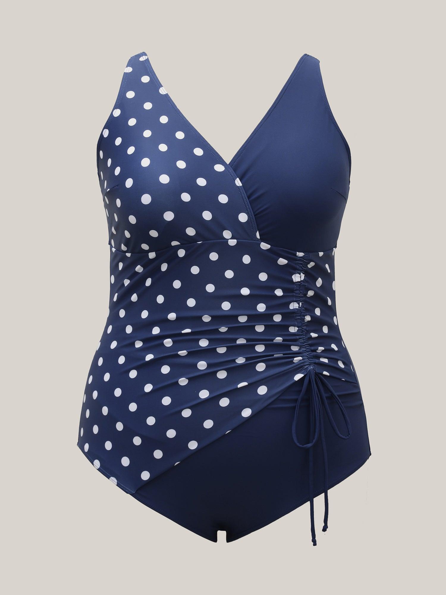 Shop Polka Dots Contrast Drawstring One-Piece Swimsuit now and redefine your style with confidence at BloomChic. Tailored for mid and plus-size women. This trendy Swimwear Women, sizes 10-30. Color:Indigo;Style:Beach;Cup Type:Removable cups;Coverage:Full;Neckline:Overlap Collar;Sleeve Type:Sleeveless;Prints:Polka dots;Details:Drawstring, Gathered, Contrast;Pocket:No-pocket;Belt:No-belt;Chest pad:Removable Padding;Lining:Lining;Closure Type:Non;Structural function:Adaptive-Fit,Tummy-Sculpt