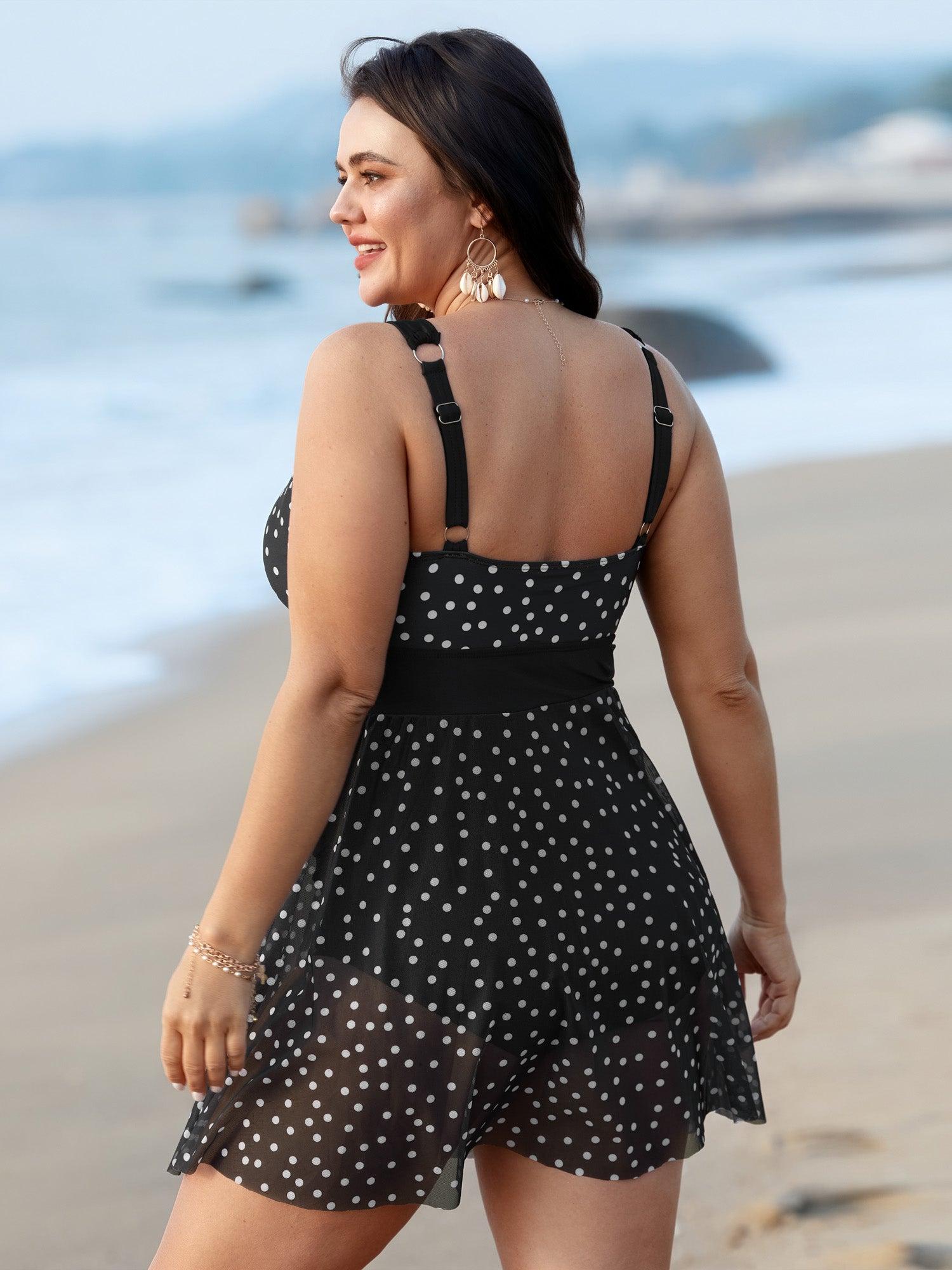 Shop Polka Dots Mesh Neckline Tie Swim Dress now and redefine your style with confidence at BloomChic. Tailored for mid and plus-size women. This trendy Swimwear Women, sizes 10-30. Color:Black;Style:Resort;Cup Type:Removable cups;Neckline:Heart neckline;Sleeve Type:Sleeveless;Prints:Polka dots;Details:Tie knot;Pocket:No-pocket;Belt:No-belt;Chest pad:Removable Padding;Lining:Lining;Closure Type:Non;Structural function:Cinched & Flared,Adaptive-Fit,Full Coverage;One-piece or split swim dresses:Built-in bottoms;Swimsuit types:Built-in Bikini Dress