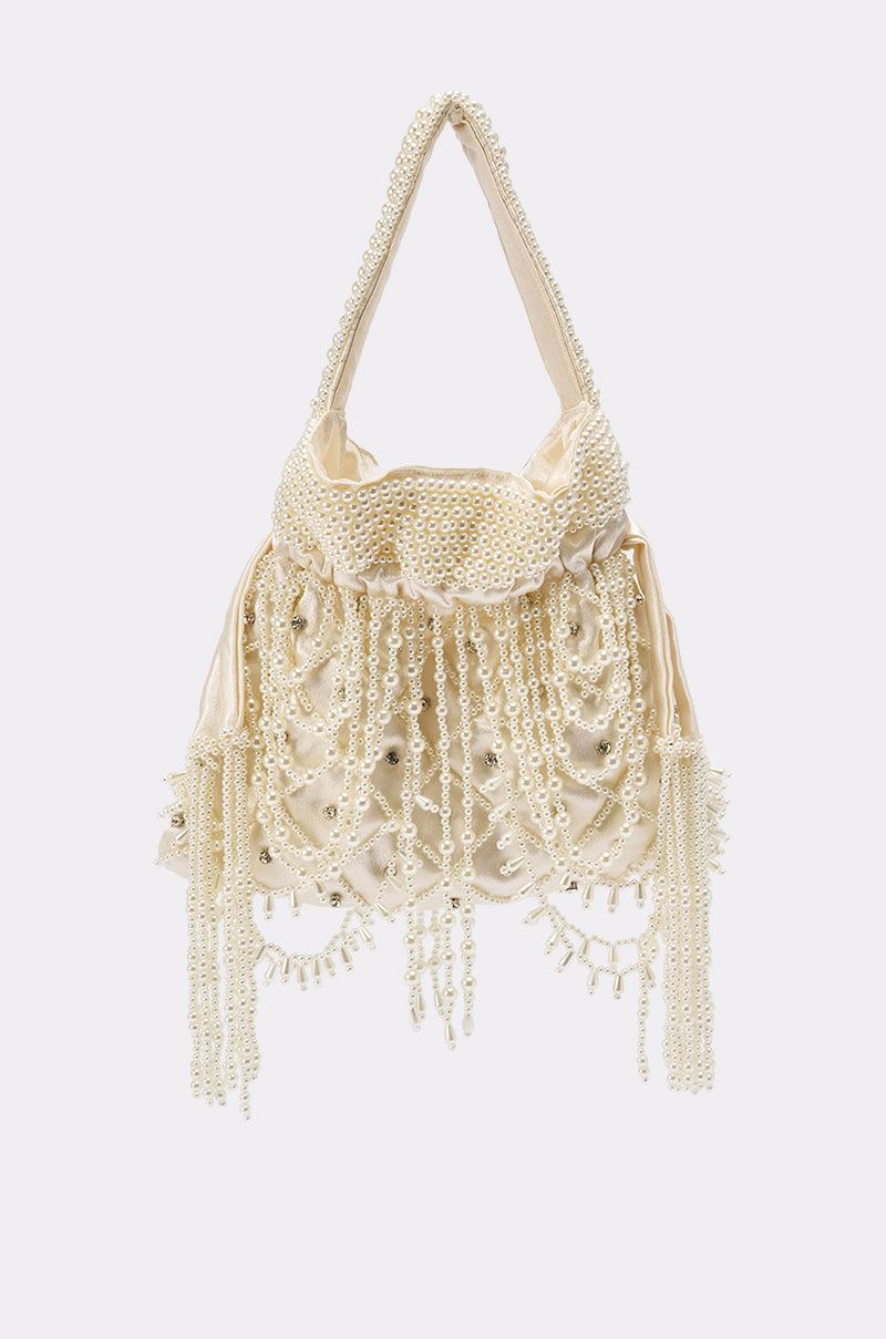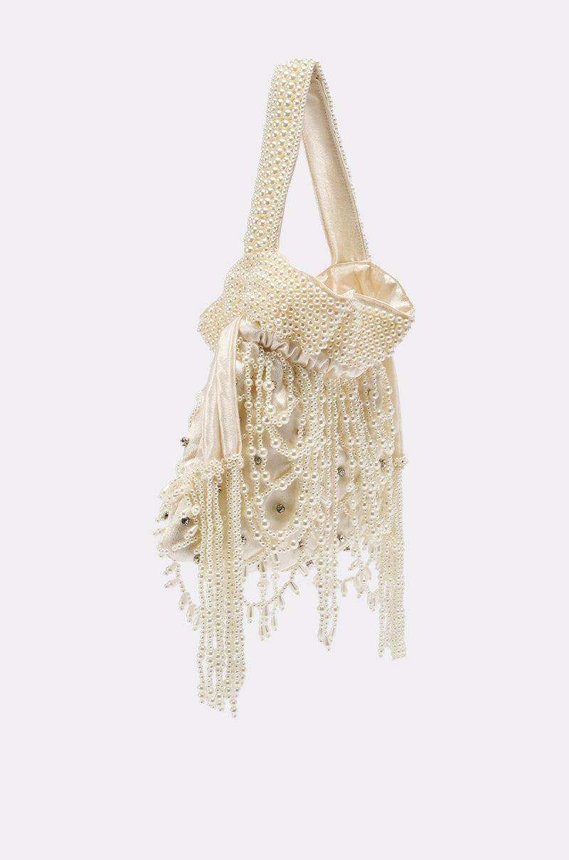 Serving pearled perfection, the AKIRA Label Polly Pearl Purse adds timeless elegance to any look. Crafted from lustrous ivory satin, this luxury clutch features intricate allover pearl beadwork on the strap and upper, lattice pearl detailing with shimmering rhinestone accents, and cascading beaded fringe for a glamorous, couture-inspired finish. The soft gathered silhouette with structured pearl detailing at the top creates a refined yet eye-catching design, while the drawstring closure offers both style and practicality. Perfect as a bridal bag, formal evening purse, or vintage-inspired accessory, this pearl beaded handbag brings sophistication, texture, and unforgettable sparkle to any elegant ensemble. - 70% Polyester 30% Plastic- Do Not Wash- Imported (all measurements are approximate from size O/S)- 9” Bag Height x 11” Length- 13” Top Handle LengthProduct ID: 1071685