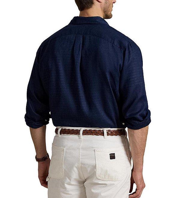 From Polo Ralph Lauren Big & Tall, this shirt features: Point collar Long sleeves with buttoned barrel cuffs Full button-front closure Signature embroidered Pony on the left side of the chest Split back yoke with a box pleat ensures a comfortable fit and a greater range of motion Linen Machine wash/tumble dry Imported.