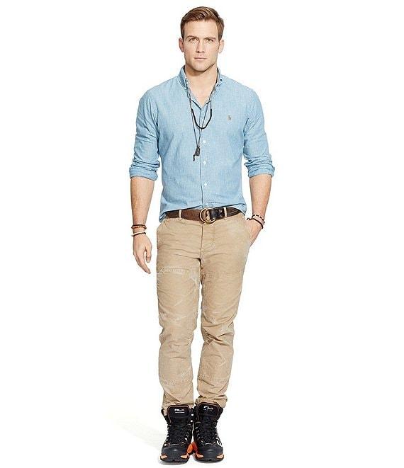 From Polo Ralph Lauren, this chambray shirt features: Chambray fabrication button-down point collar applied button placket long sleeves; buttoned barrel cuffs Ralph Lauren's multicolored signature embroidered pony accents the left chest split back yoke with a box pleat ensures a comfortable fit and a greater range of motion shirttail hemline cotton machine wash Imported. *This product is designed to look slightly rumpled when shipped.