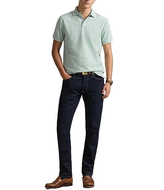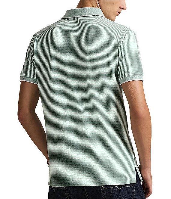 From Polo Ralph Lauren, this shirt features: Striped design Ribbed polo collar Short sleeves with ribbed armbands 3-button placket Genuine mother-of-pearl buttons custom-developed with a “Ralph Lauren” logo Signature embroidered "Pony" on the left side of chest Even vented hem Pullover construction Classic fit Cotton/elastane mesh Machine wash/tumble dry Imported.