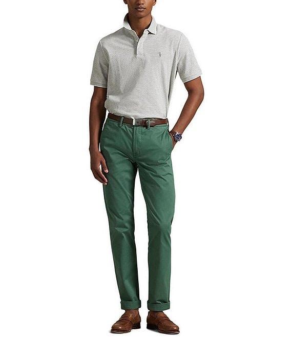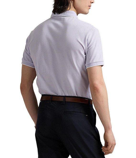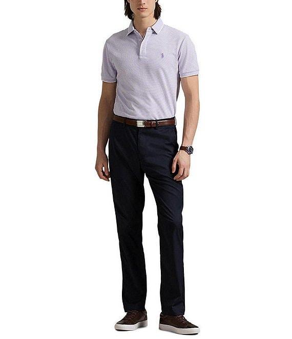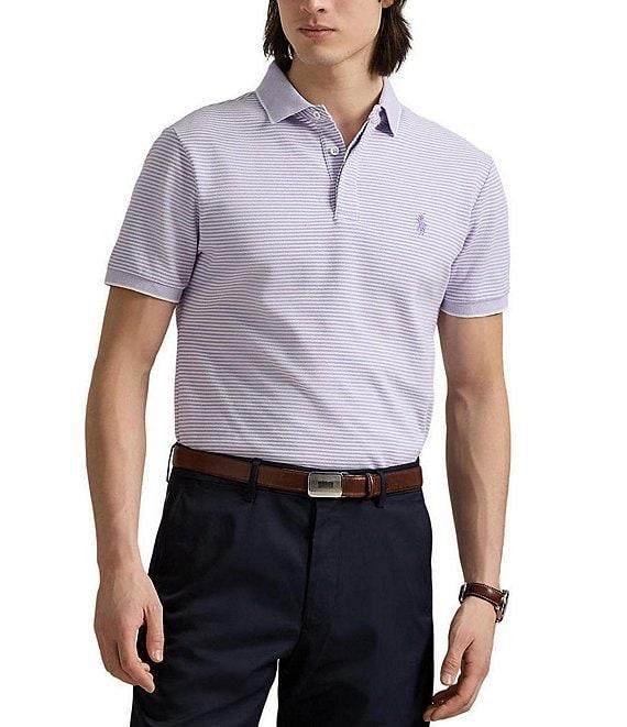 From Polo Ralph Lauren, this polo shirt features: Ribbed Polo collar with contrast tipping Concealed 3-button placket Genuine mother-of-pearl buttons Short sleeves Signature embroidered "Pony" on the left side of the chest Contrast tipping at the ribbed armbands Even vented hem Pullover construction Stretch mesh fabric Cotton/elastane Machine wash/tumble dry Imported.