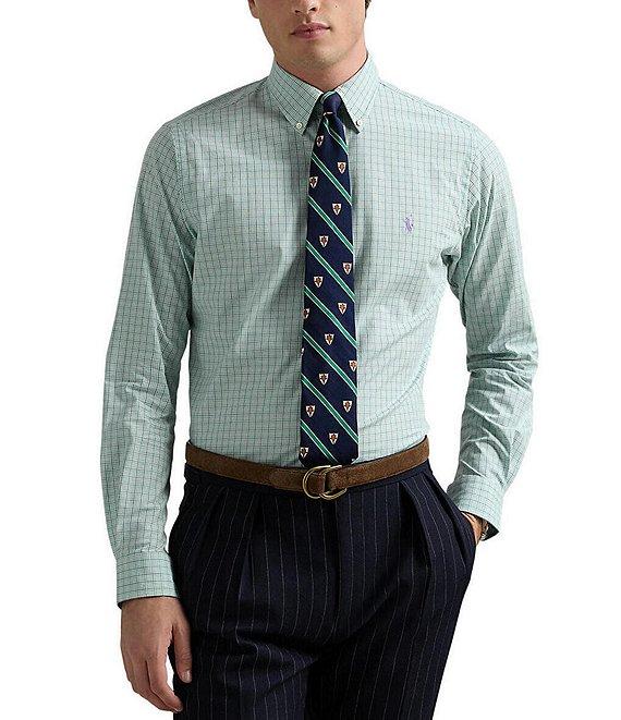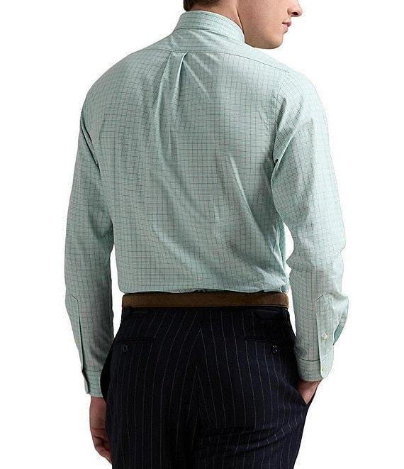 From Polo Ralph Lauren, this shirt features: Button-down collar Long sleeves with buttoned barrel cuffs Button-front closure Signature embroidered Pony on the left side of the chest Split back yoke with a box pleat ensures a comfortable fit and a greater range of motion Stretch poplin fabric Cotton/elastane Machine wash/tumble dry Imported.