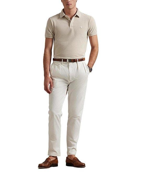 From Polo Ralph Lauren, this polo shirt features: Ribbed Polo collar with contrast tipping Concealed 3-button placket Genuine mother-of-pearl buttons Short sleeves Signature embroidered Pony on the left side of the chest Contrast tipping at the ribbed armbands Even vented hem Stretch mesh fabric Cotton/elastane Machine wash/tumble dry Imported.