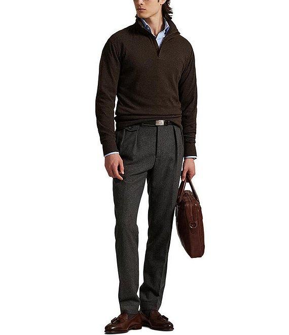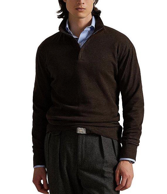 From Polo Ralph Lauren, this pullover features: Houndstooth pattern Signature embroidered pony at the left chest Quarter-zip placket with faux-suede facing Zipper pull custom-developed with a Polo logo Long sleeves with banded cuffs Banded hem Cotton/viscose/nylon Machine wash/tumble dry Imported.