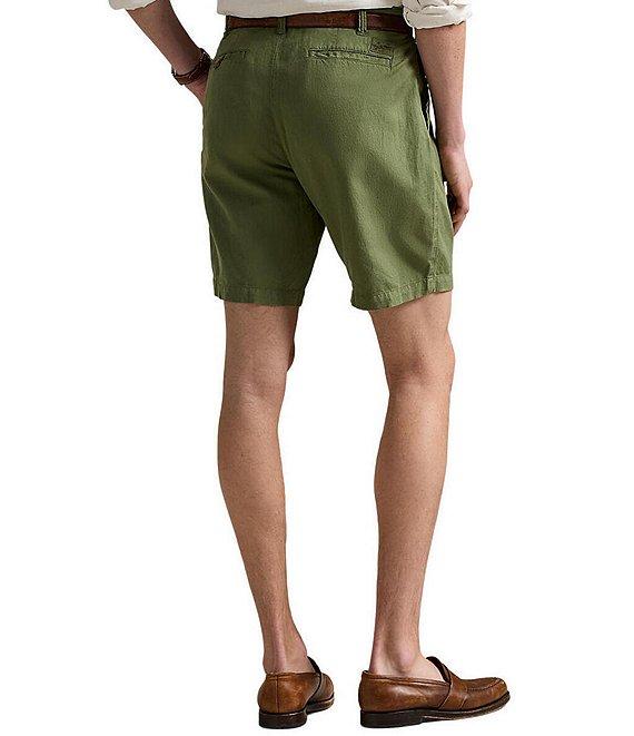 From Polo Ralph Lauren, these shorts feature: lightweight, breathable fabricmid-rise2 front angled pocketsright hip coin pocketback left buttoned pocketback right welt pocket“Polo RL Naval Tailors” label at the back right pocketflat frontknee lengthzip fly with a buttoned closure; belt loops8.5" inseamlinen/cottonmachine wash/tumble dryImported.