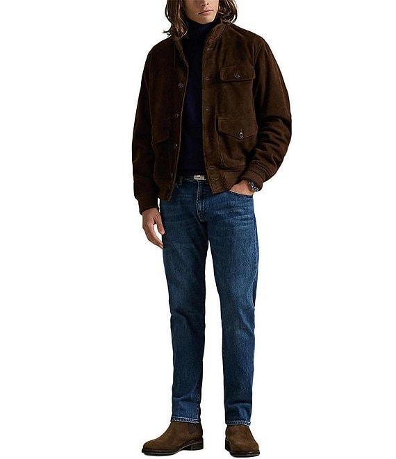 From Ralph Lauren, these jeans feature: Regular rise Zipper-front closure Belt loops 5-pocket jeans Relaxed fit through the seat and thigh Tapered from the knee down Metal button custom-developed with a “Polo Ralph Lauren” logo Metal rivets custom-developed with a “PRL 67” logo Leather “Polo Ralph Lauren” patch on the back right waist Stretch fabric Cotton/polyester/elastane Machine wash/tumble dry Imported.