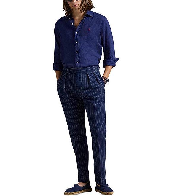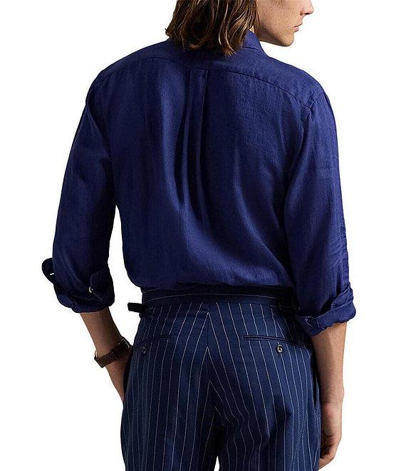 From Polo Ralph Lauren, this shirt features: Button-down point collar Long sleeves with buttoned barrel cuffs Button-front closure Signature embroidered "Pony" on the left side of the chest Split back yoke with a box pleat ensures a comfortable fit and a greater range of motion Linen Machine wash/tumble dry Imported.