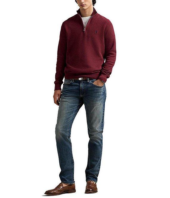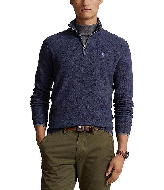 From Polo Ralph Lauren, this sweater features: Rib-knit mock neck with striped tipping at the interior Long sleeves with rib-knit cuffs Quarter-zip placket Signature embroidered "pony" on the left side of chest Rib-knit hem Pullover construction Lightweight cotton Hand wash or dry clean Imported.