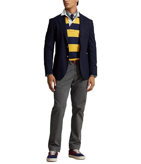 From Polo Ralph Lauren, these pants feature:Stretch twillFlat frontStraight fitZip fly/button closureBelt loopsTwo front angled pockets; with right hip coin pocketTwo back-buttoned welt pocketsSignature embroidered pony above back right pocketCotton/elastaneMachine wash/tumble dryImported.