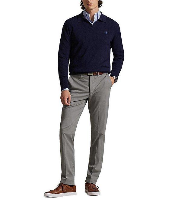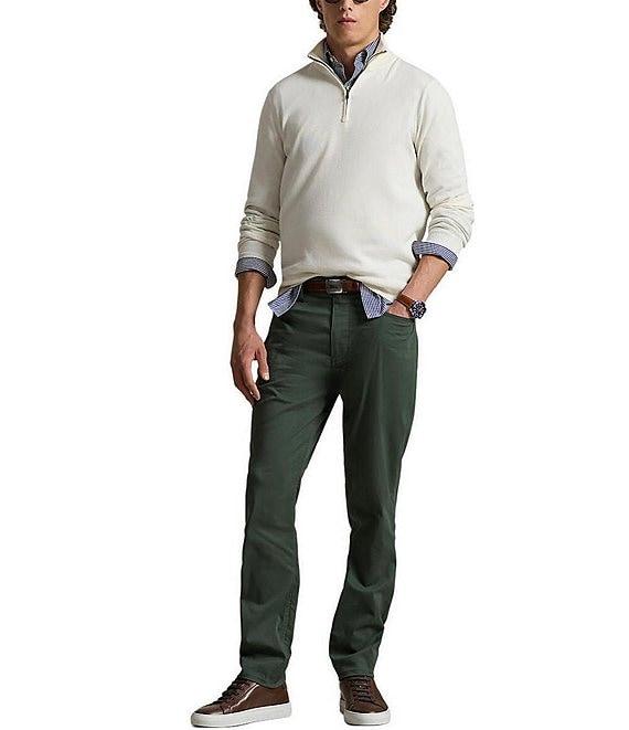 From Polo Ralph Lauren, these pants feature: Mid rise Straight fit Sits below the waist Zip/button-front closure Belt loops 5-pocket pants Straight legs Curtain waistband 2 front angled pockets Right hip coin pocket 2 back buttoned pockets Signature embroidered "pony" above the back-right pocket Buttons custom-developed with a “Polo Ralph Lauren” logo Cotton/polyester/elastane twill Machine wash/tumble dry Imported.