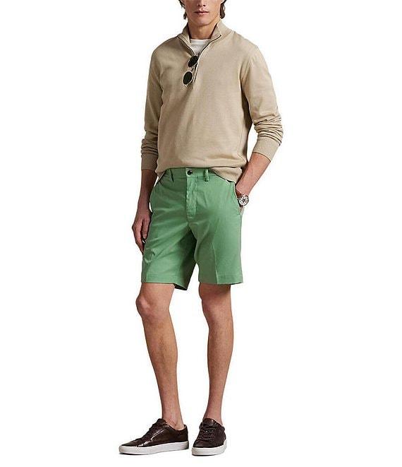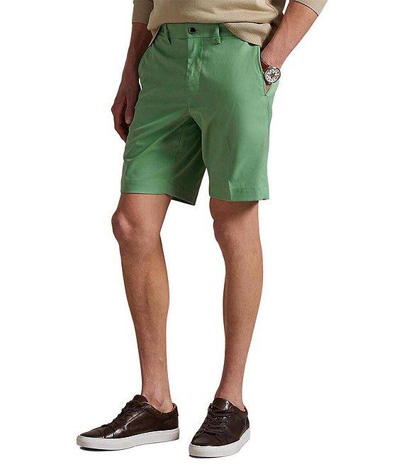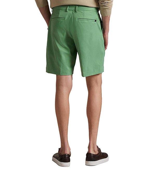 From Polo Ralph Lauren, these shorts feature: Tailored fit Belt loops Zip fly with a buttoned closure 2 front angled pockets 2 back welt pockets Right hip coin pocket Concealed zip pocket on the right side seam "Polo" label on the back right pocket 9" inseam Moisture-wicking Stretch fabric Recycled polyester Machine wash/tumble dry Imported.