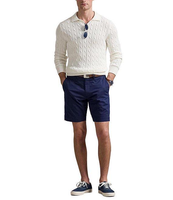From Polo Ralph Lauren, these shorts feature: Tailored fit Belt loops Zip fly with a buttoned closure Curtain waistband 2 front angled pockets 2 back buttoned pockets Right hip coin pocket "Polo" label on the back right pocket 9" inseam Moisture-wicking Stretch fabric Cotton/polyester/elastane Machine wash/tumble dry Imported.