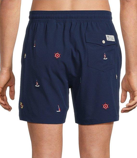 From Polo Ralph Lauren, these swim trunks feature: Nautical-inspired embroidery throughout Classic fit Pull-on styling Side on-seam pockets Back-right buttoned pocket with an extra buttonhole for drainage “Polo Ralph Lauren Swimwear” label at the back pocket Signature embroidered Pony at the left hem Interior mesh brief Approx. 5.75” inseam Shell of cotton/polyester/elastane; brief of polyester Machine wash/tumble dry Imported.
