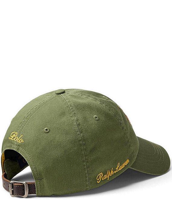 From Polo Ralph Lauren, this cap features: "Triple-Pony" logo embroidered on the front “Ralph Lauren” script embroidered at the right side “Polo” script embroidery and a buckled leather strap at the back Seamed bill Ventilating embroidered eyelets Cotton twill sweatband Lined at the front panels Shell and front panel lining of cotton; strap of leather One size Machine wash/tumble dry Imported.