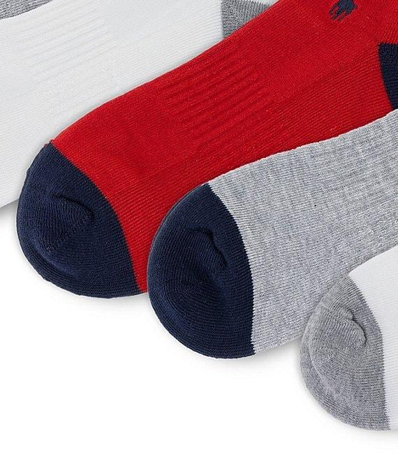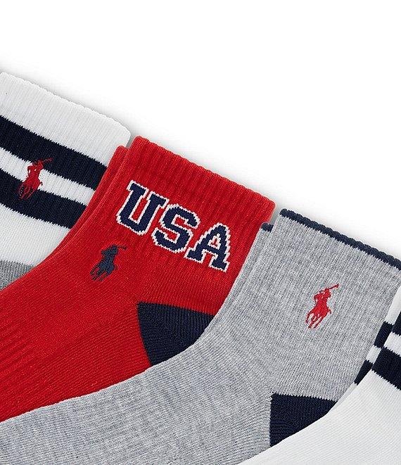 From Polo Ralph Lauren, this 6-pack of quarter socks features: (2) pairs of striped-cuff socks (2) pairs of solid socks with striped tipping (1) pair of knit-in "USA" socks (1) pair of "USA" and crest motif socks Each pair offers: 144-needle count construction Moisture management 3x1 mock rib 3x1 mock rib arch support Polo player embroidery Contrasting reinforced heel and toe Half cushion One size fits men's shoe sizes 6-12.5 Recycled polyester/spandex (exclusive of decoration) Machine wash/tumble dry Imported.