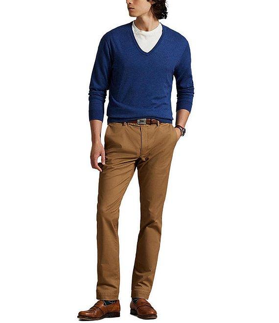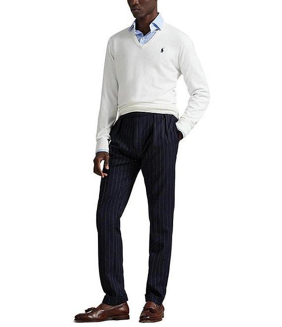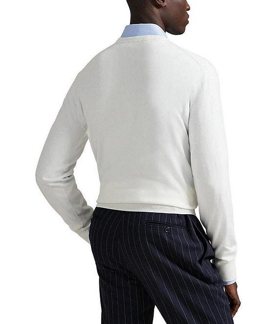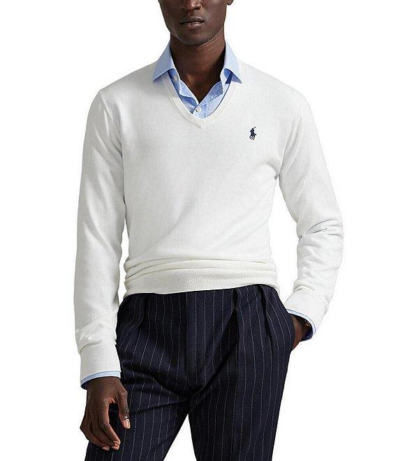 From Polo Ralph Lauren, this sweater features: V-neckline Long sleeves with rib-knit cuffs Signature embroidered "Pony" on the left side of the chest Rib-knit hem Pullover construction Finely knit soft cotton Machine wash/tumble dry Imported.