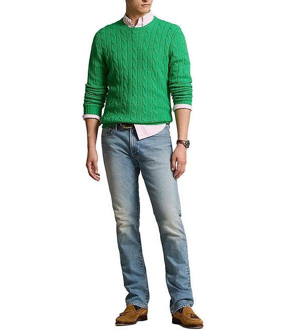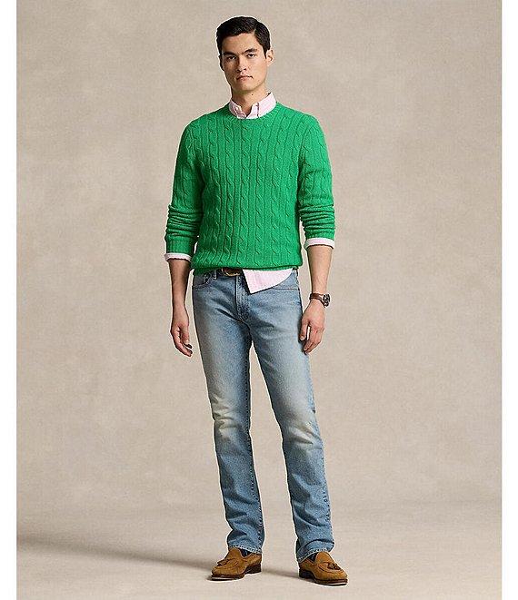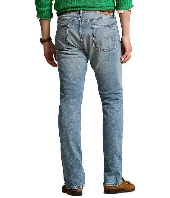 From Polo Ralph Lauren, these jeans feature: Varick slim straight fit Sits below the waist Trim through the seat and the thigh Slightly tapered leg Belt loops Zip fly with a signature buttoned closure Five-pocket styling with signature metal rivets Leather “Polo Ralph Lauren” patch at the back right waist Stretch denim fabric Cotton/elastane Machine wash Imported.