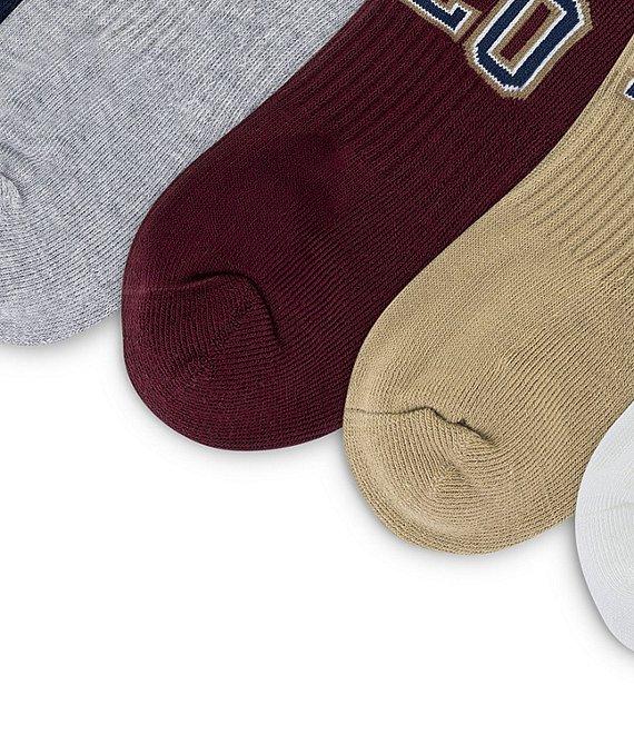 From Polo Ralph Lauren, this 6-pack of socks features: (6) pairs of crew socks 144-needle count construction "Polo" block lettering and signature embroidered "Pony" 3x1 mock rib 3x1 mock rib arch support Reinforced heel and toe Flat toe seaming One size fits men's shoe sizes 6-12.5 Recycled polyester/other fibers/spandex (exclusive of decoration) Machine wash/tumble dry Imported.