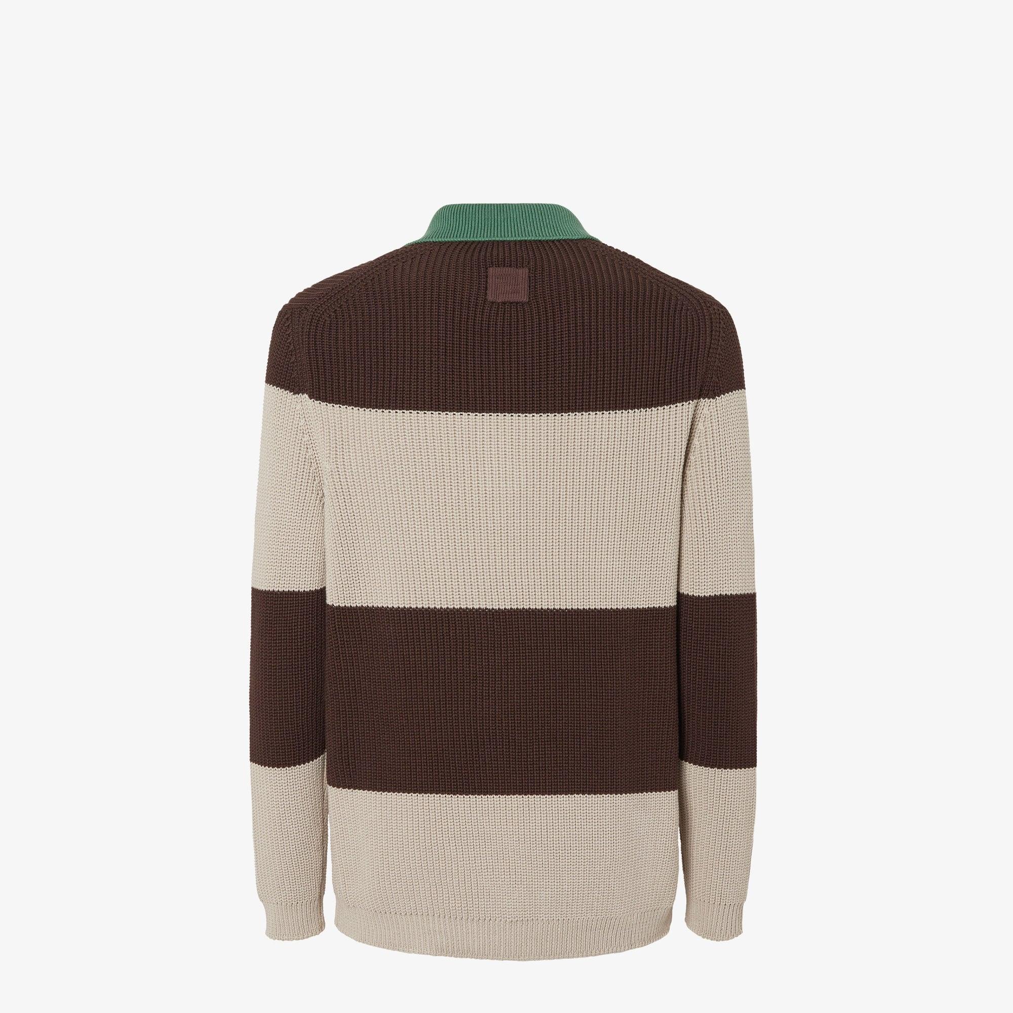 Long-sleeved jersey polo shirt featuring a classic collar and button fastening. Ribbed edges. Made of rib knit cotton with a horizontal striped motif in shades of brown and beige. Customized with an embroidered Fendi Club crest applied to the chest. Finished with a contrasting green collar and embossed FF patch on the back of the collar. Made in Italy