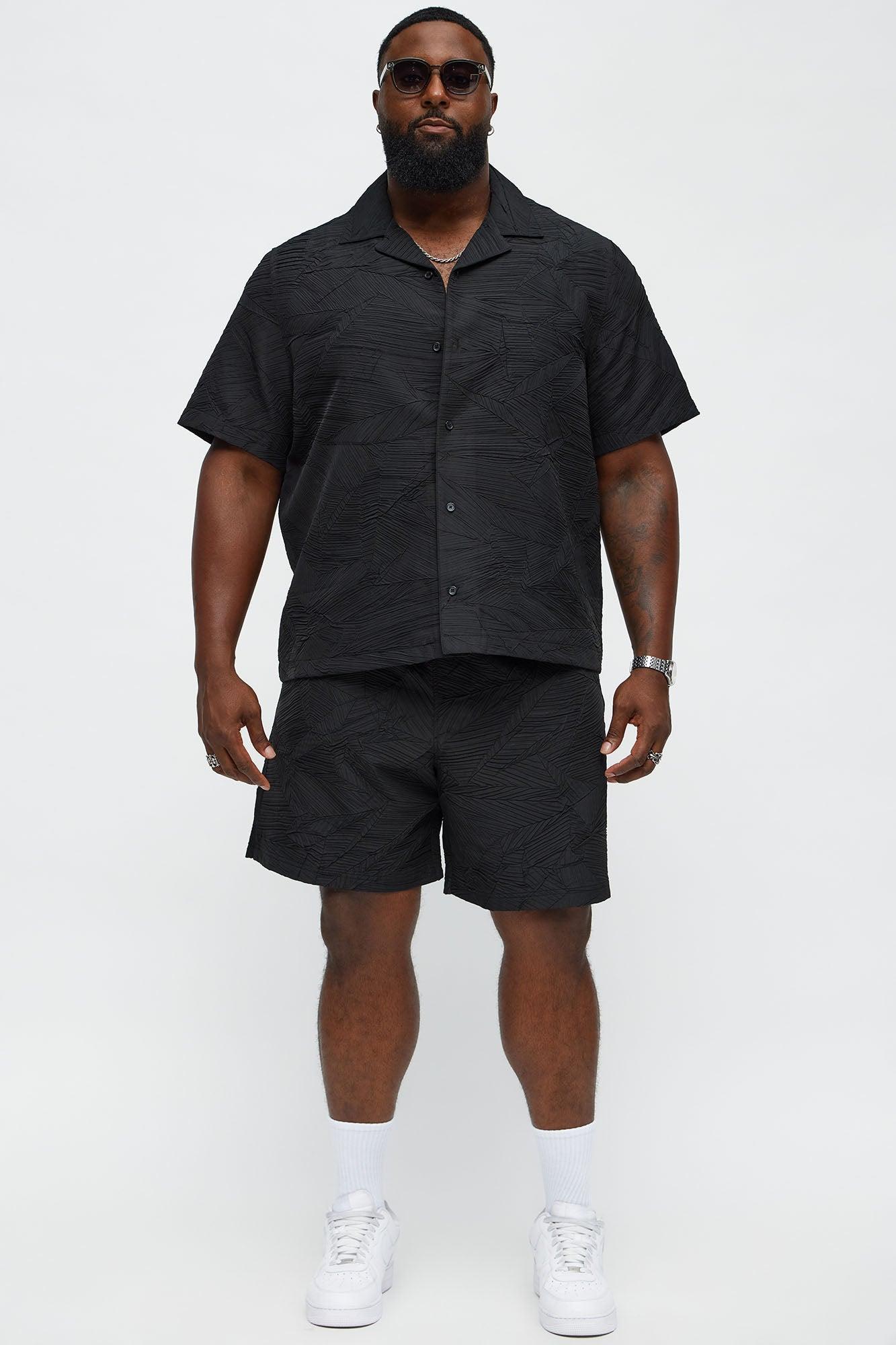 Available In Black, Cream And Mustard. Cuban Collar Front Button Closure Jacquard Short Sleeve Pair With "Ponce Textured Shorts" 100% Polyester Imported California Proposition 65WARNING: Cancer and Reproductive Harm - www.P65Warnings.ca.gov.